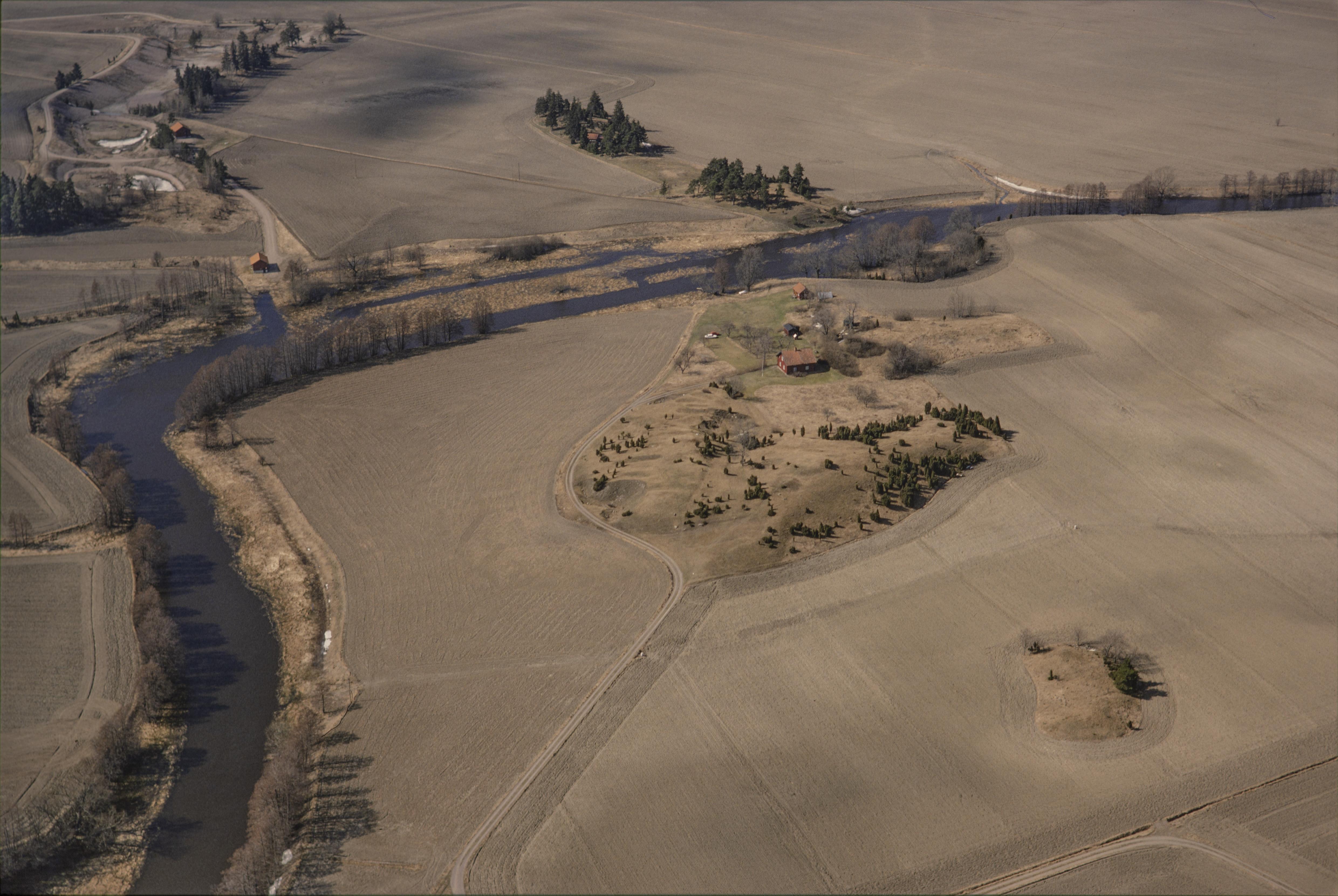 Beskrivning: Fyrisåns dalgång. Ån markerar gränsen mot socknet Bälinge (i bildens vänstra och övre del). Vid bildens mitt Valsgärde (skrivs även Vallsgärde) gravfält RAÄnr Uppsala 209:1. I bildens övre del stensättning RAÄnr Bälinge 310:1. Bilden är tagen mot (väderstreck): NV