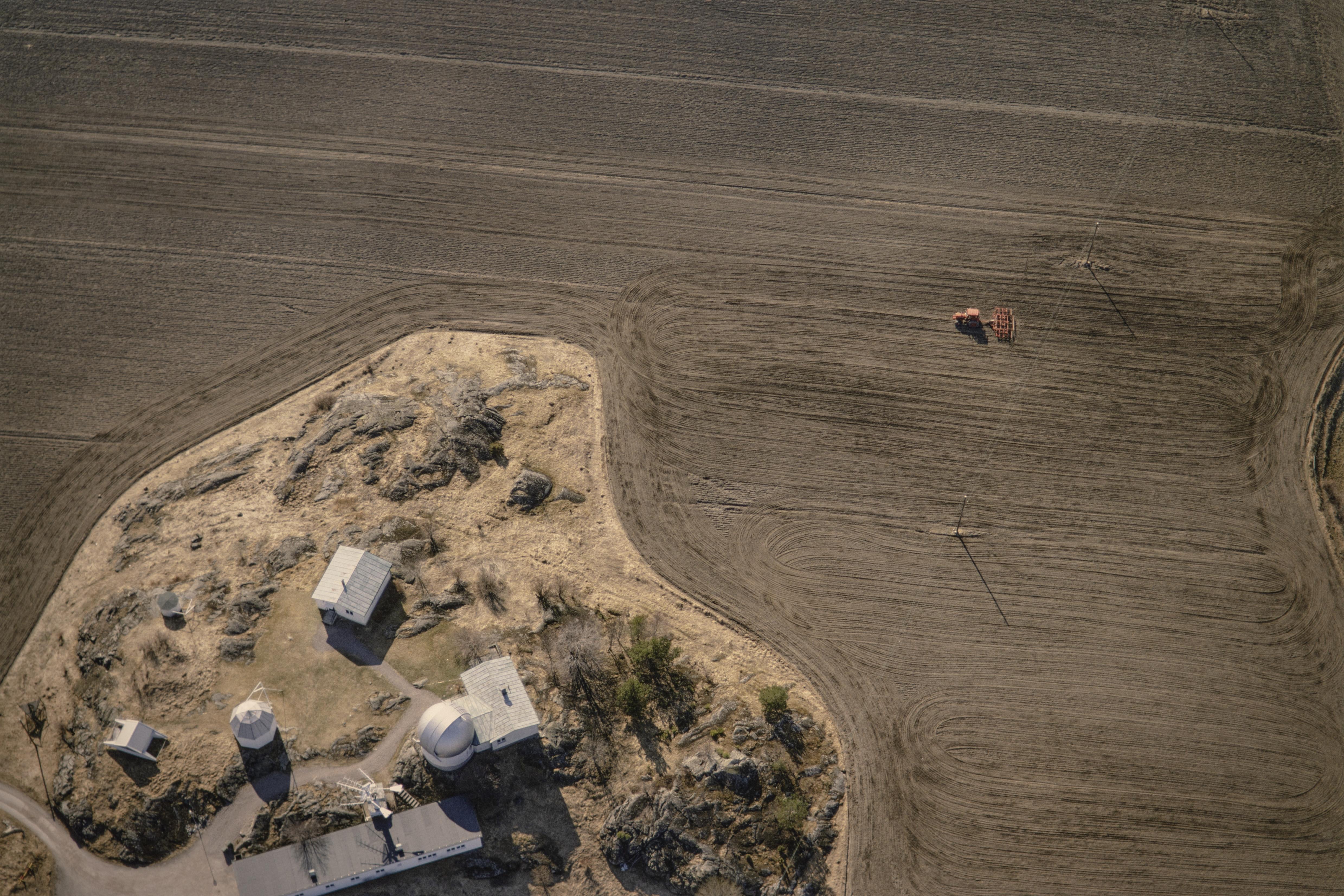 Beskrivning: Hällby. Nere tilll vänster byggnader med observatorium för geodesi (Uppsala universitet och hög RAÄnr Uppsala 322:1. Traktor på åker uppe till höger. Bilden är tagen mot (väderstreck): V