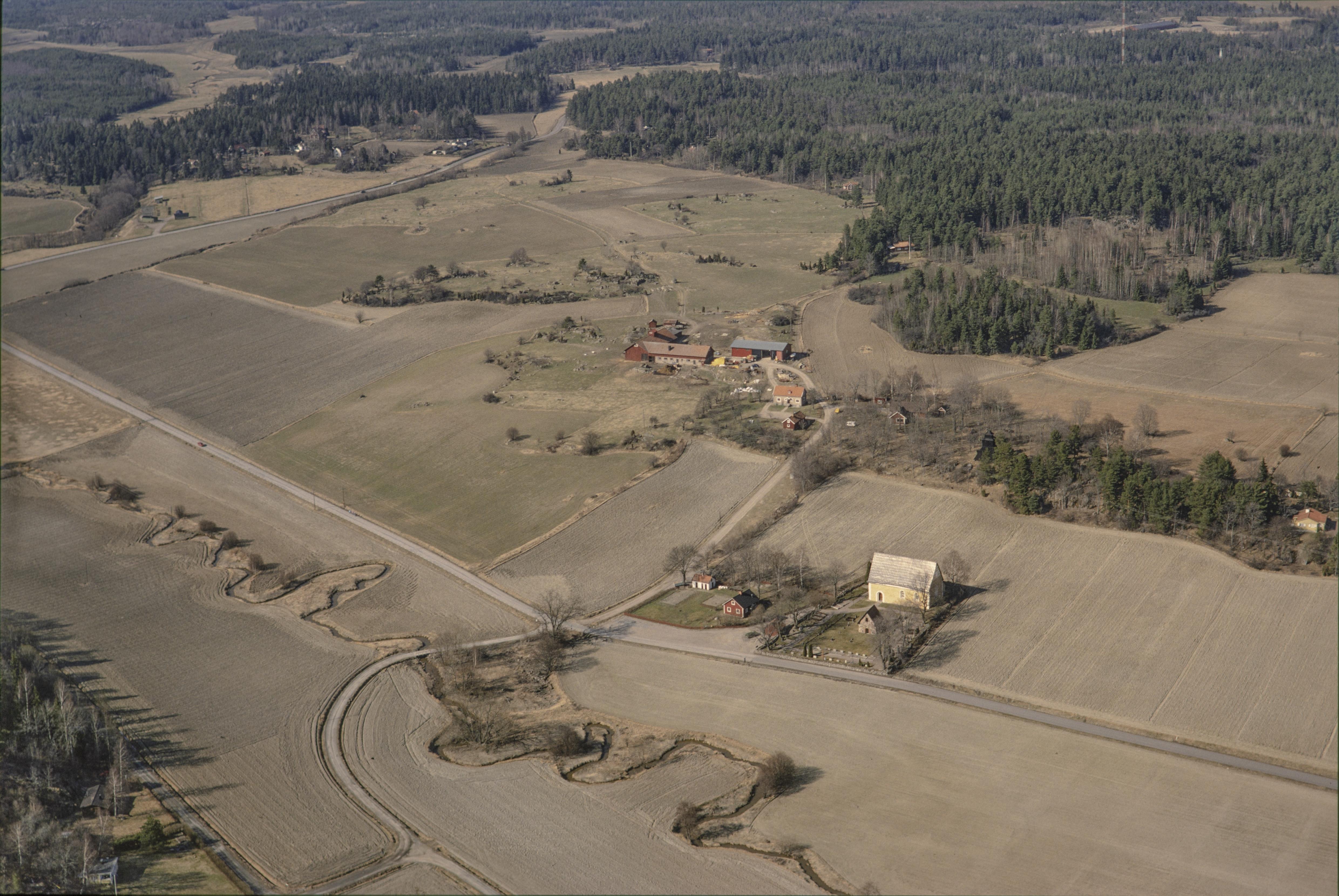 Beskrivning: Till höger under bildens mitt Uppsala-Näs kyrka RAÄnr Uppsala-Näs 69:1 i Näsbäckens dalgång. Bilden är tagen mot (väderstreck): N