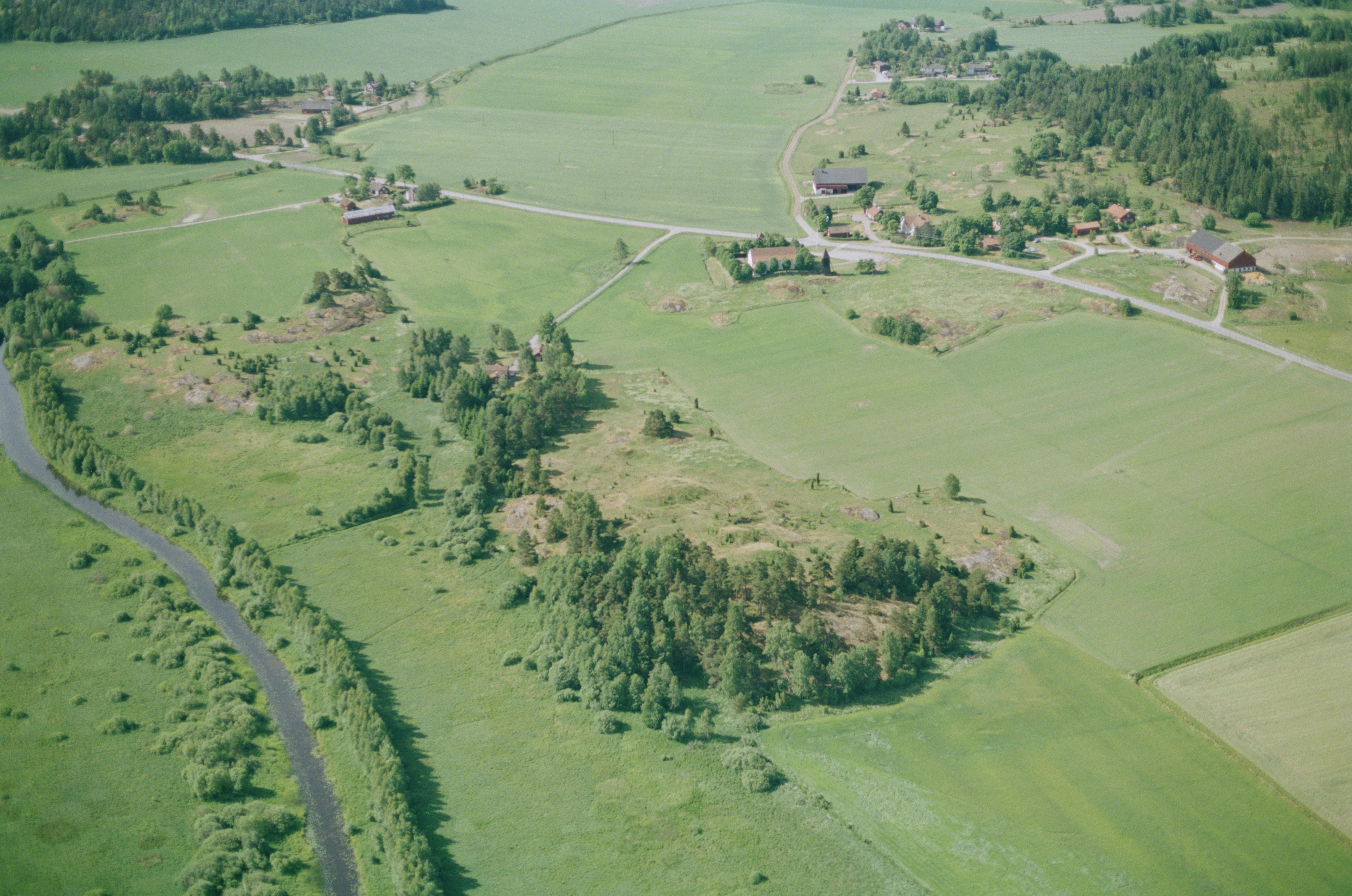 Beskrivning: Helgöåns dalgång i Långhundraleden. Ån markerar gränsen mot socknet Össeby-Garn (i bildens vänstra kant). Vid bildens mitt gravfältet Sjökullarna RAÄnr Vada 10:1. Över bildens mitt Vada kyrka. Bilden är tagen mot (väderstreck): SV
