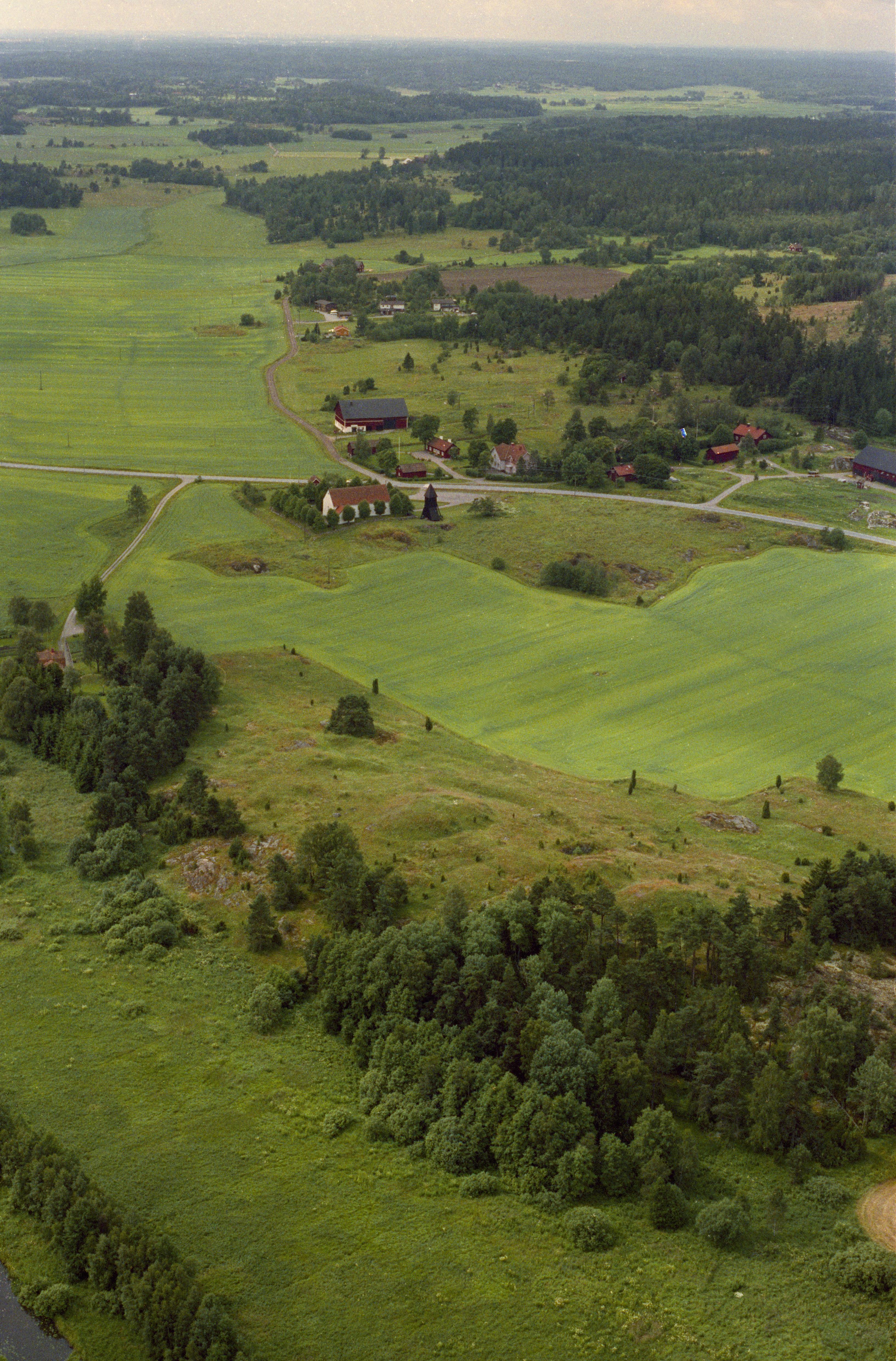 Beskrivning: Helgöåns dalgång i Långhundraleden. Ån markerar gränsen mot socknet Össeby-Garn (nere i bildens vänstra hörn). Under bildens mitt gravfältet Sjökullarna RAÄnr Vada 10:1. Vid bildens mitt Vada kyrka. Bilden är tagen mot (väderstreck): SV