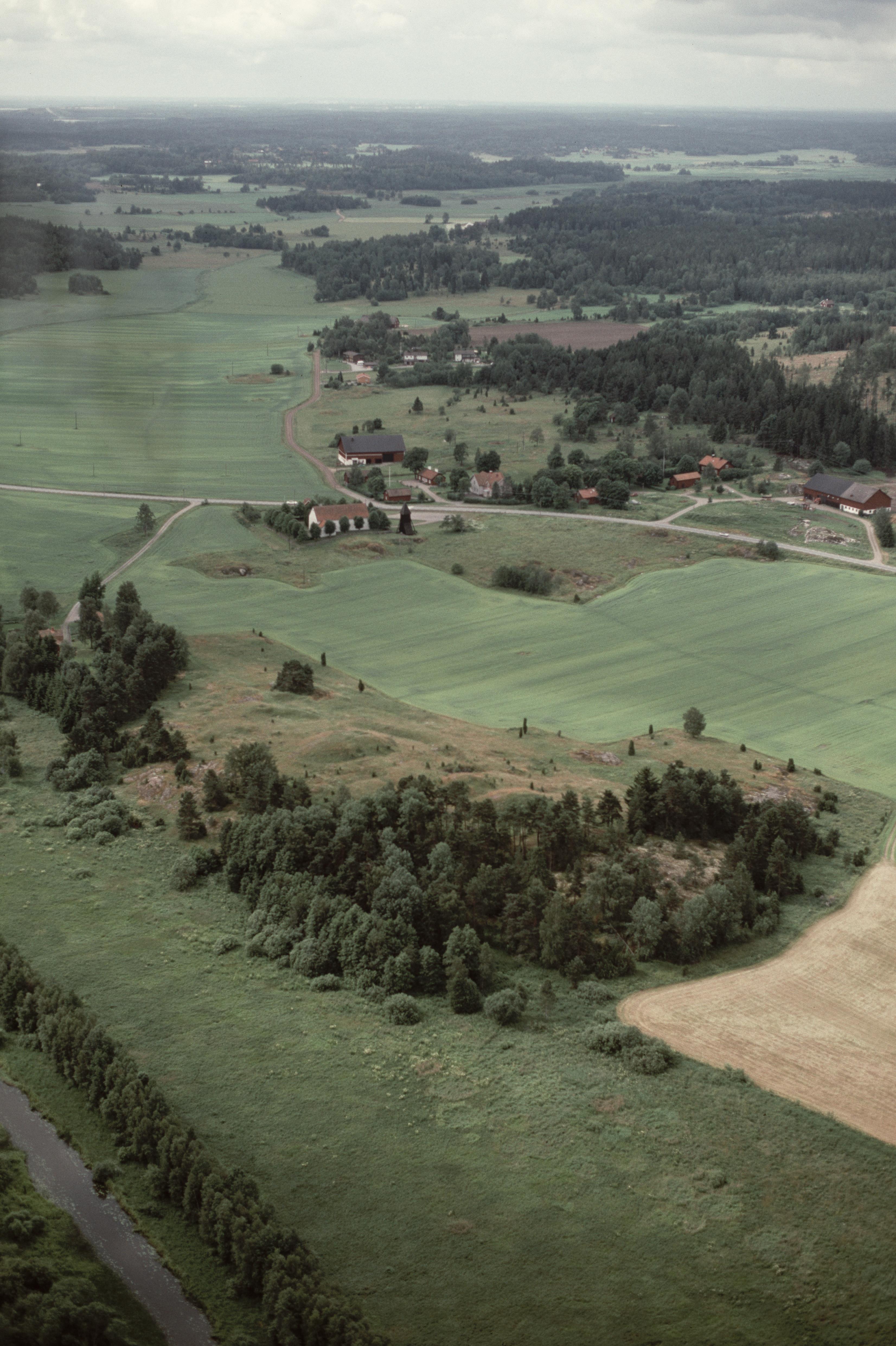 Beskrivning: Helgöåns dalgång i Långhundraleden. Ån markerar gränsen mot socknet Össeby-Garn (nere i bildens vänstra hörn). Under bildens mitt gravfältet Sjökullarna RAÄnr Vada 10:1. Vid bildens mitt Vada kyrka. Bilden är tagen mot (väderstreck): SV
