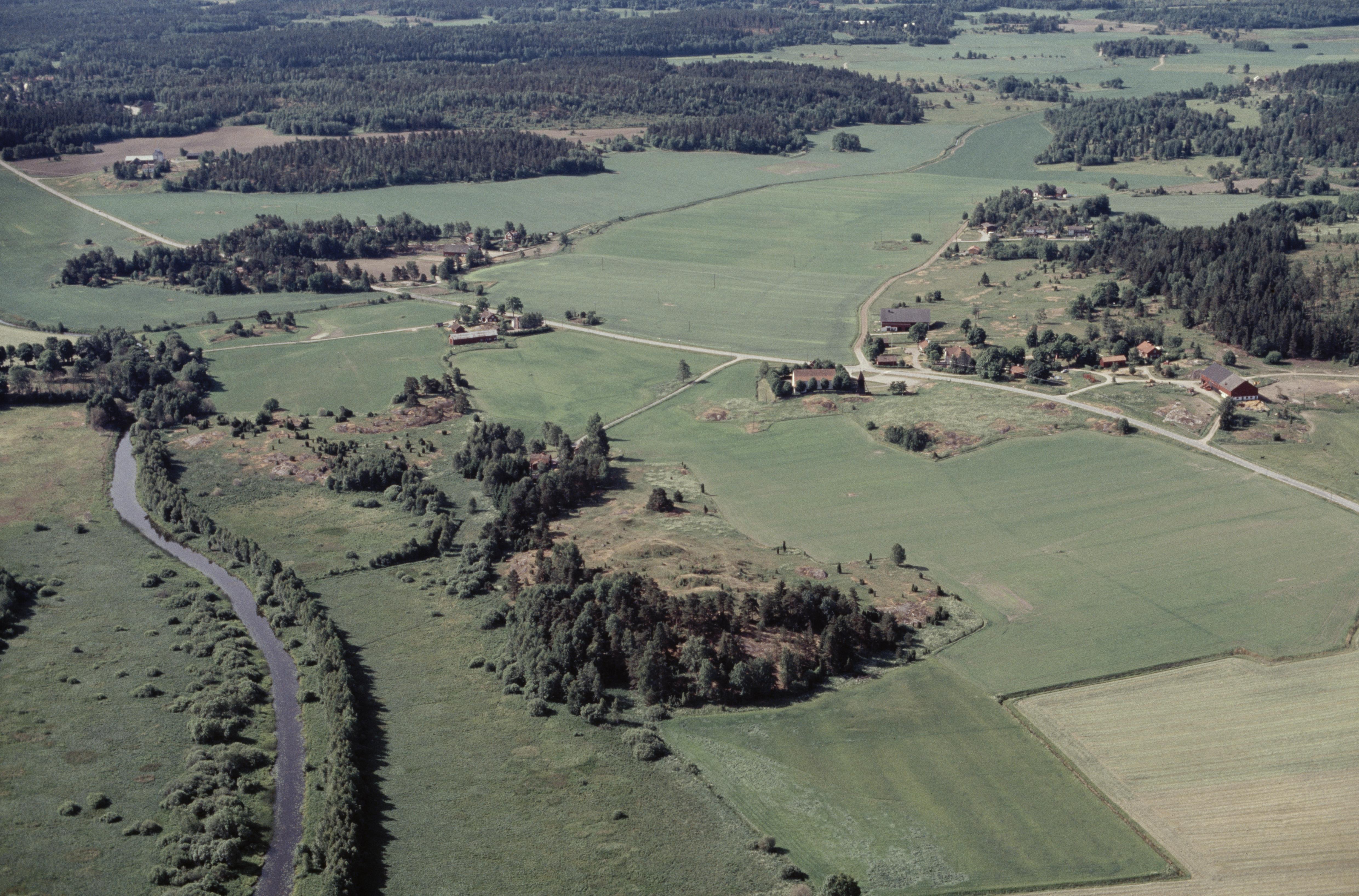 Beskrivning: Helgöåns dalgång i Långhundraleden. Ån markerar gränsen mot socknet Össeby-Garn (i bildens vänstra del). Under bildens mitt gravfältet Sjökullarna RAÄnr Vada 10:1. Över bildens mitt Vada kyrka. Bilden är tagen mot (väderstreck): SSV
