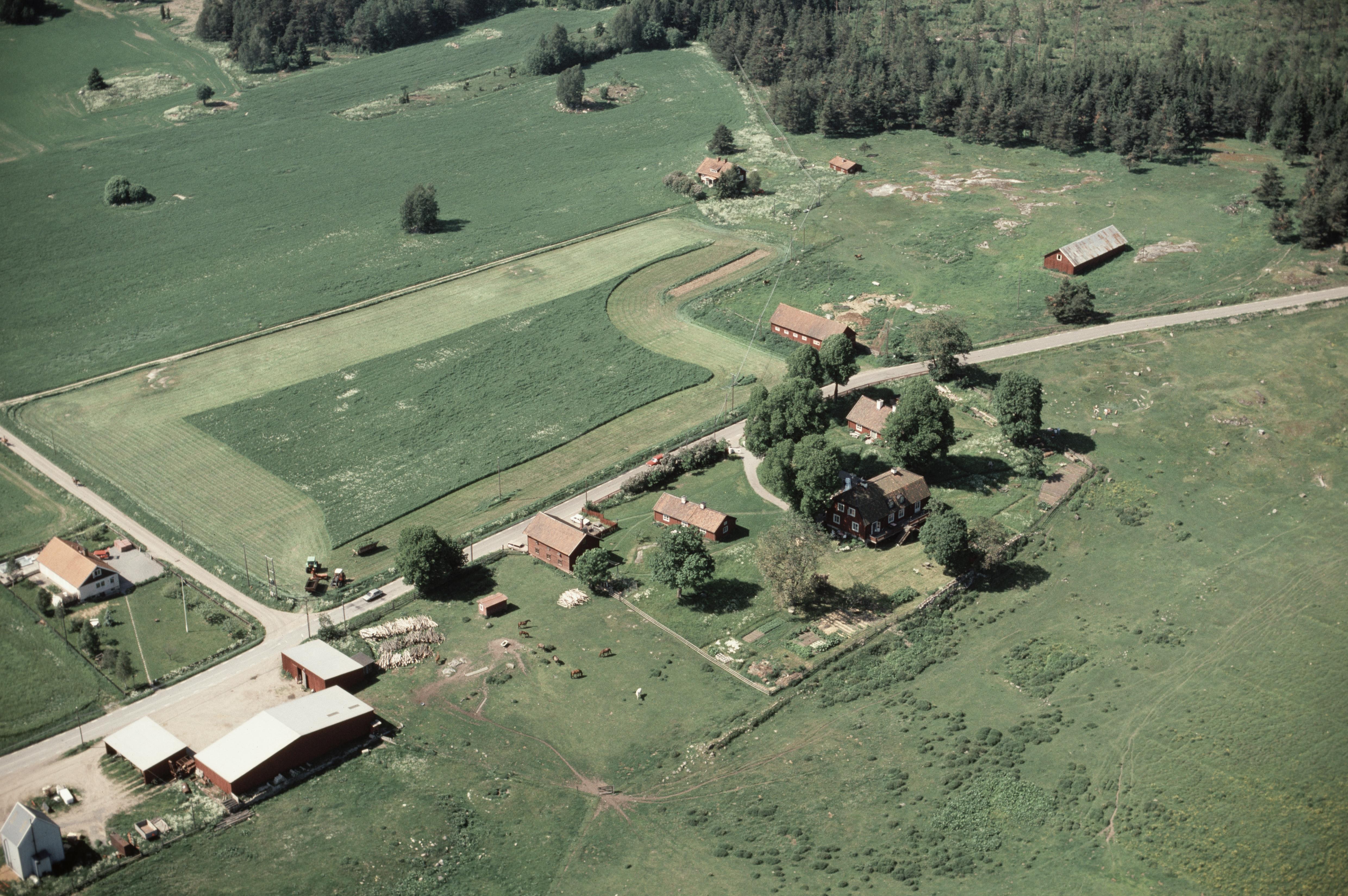Beskrivning: Stora Benhamra gård i Långhundraleden. Uppe till höger gravfält RAÄnr Vada 5:1. Bilden är tagen mot (väderstreck): NV