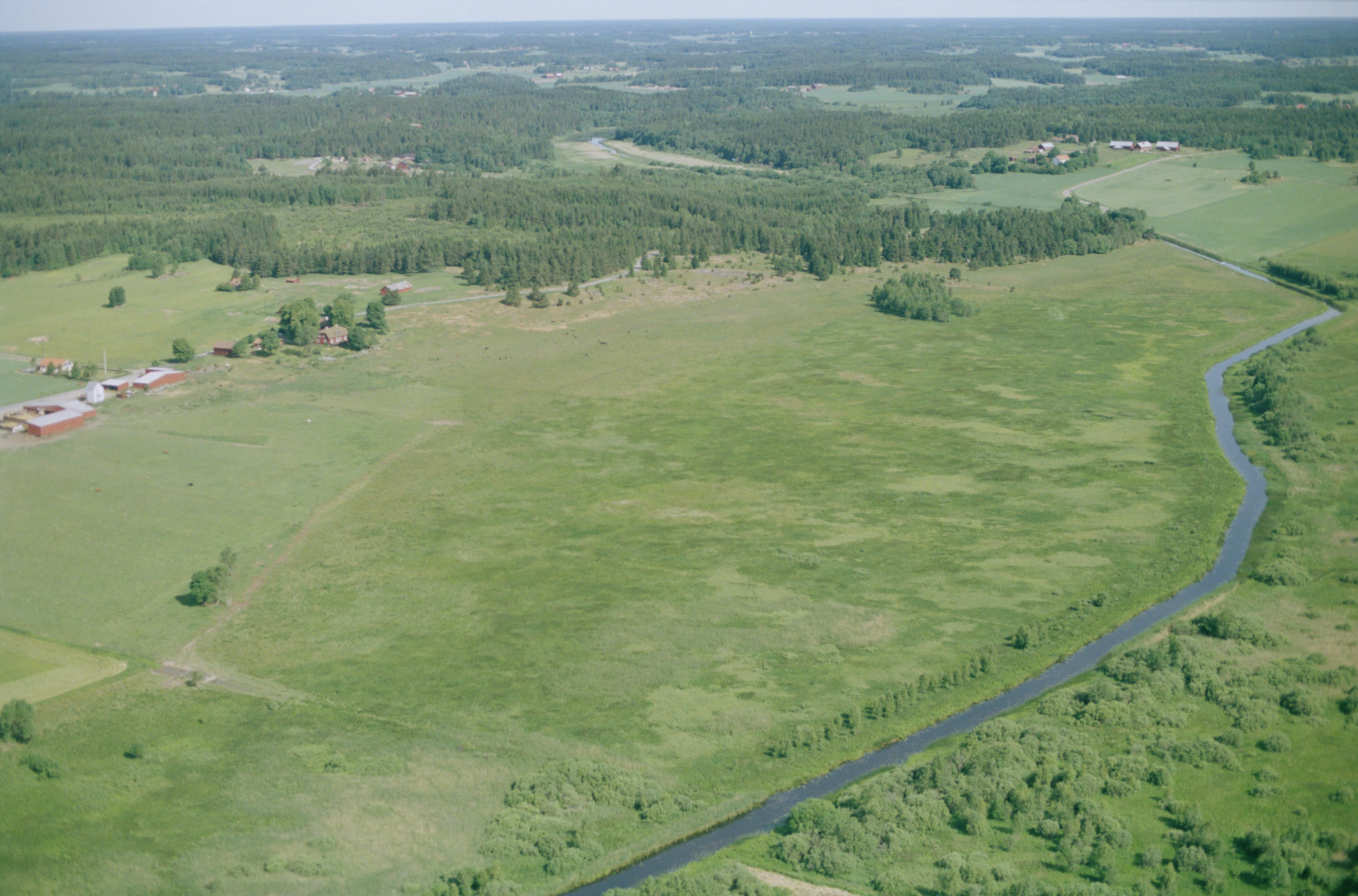 Beskrivning: Stora Benhamra gård i Långhundraleden och Helgöåns dalgång. Över bildens mitt gravfält RAÄnr Vada 5:1. Till vänster om bildens mitt hög RAÄnr Vada 9:1. Bilden är tagen mot (väderstreck): NNV