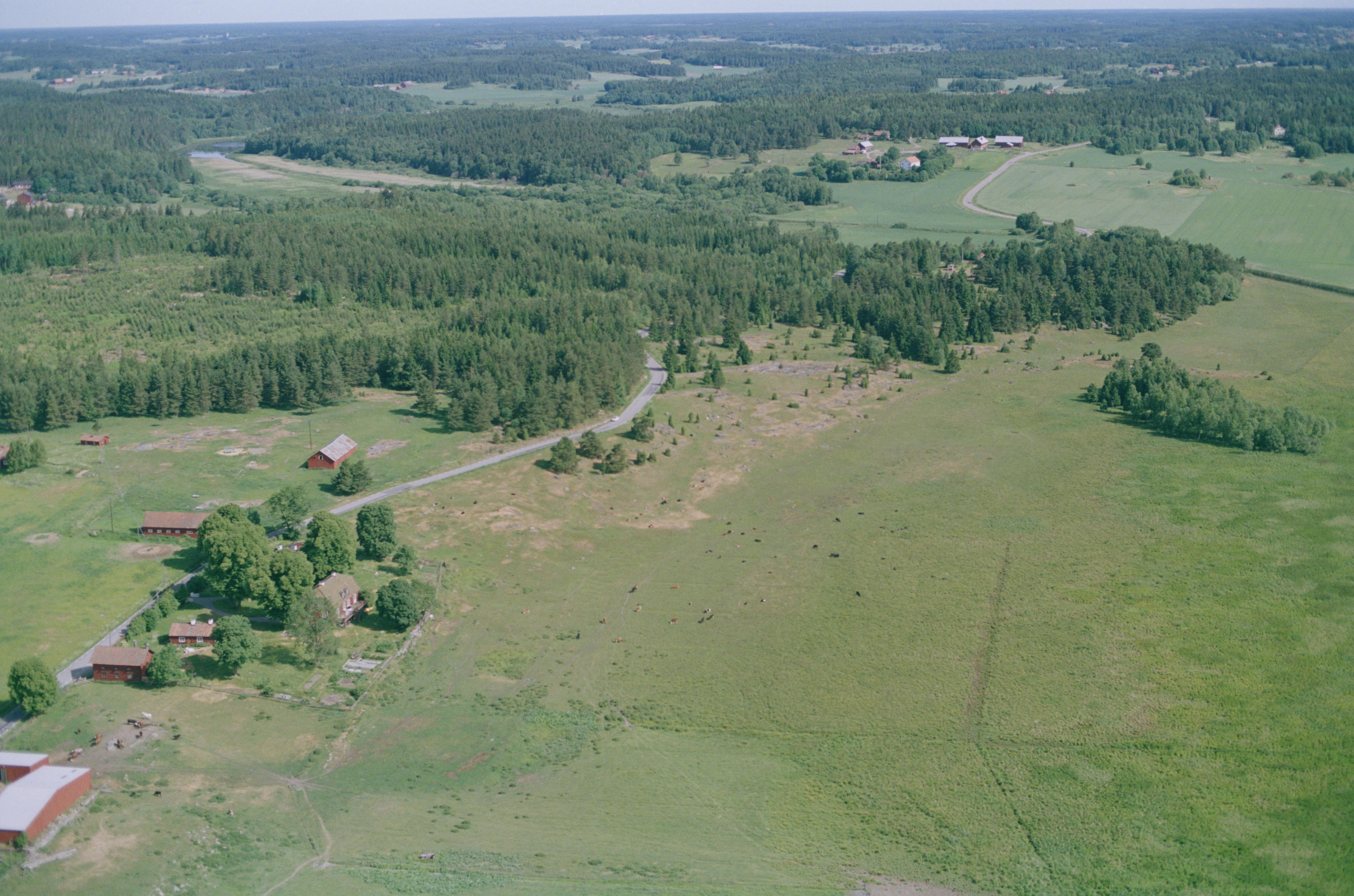 Beskrivning: Stora Benhamra gård i Långhundraleden och Helgöåns dalgång. Vid bildens mitt gravfält RAÄnr Vada 5:1. Bilden är tagen mot (väderstreck): NV