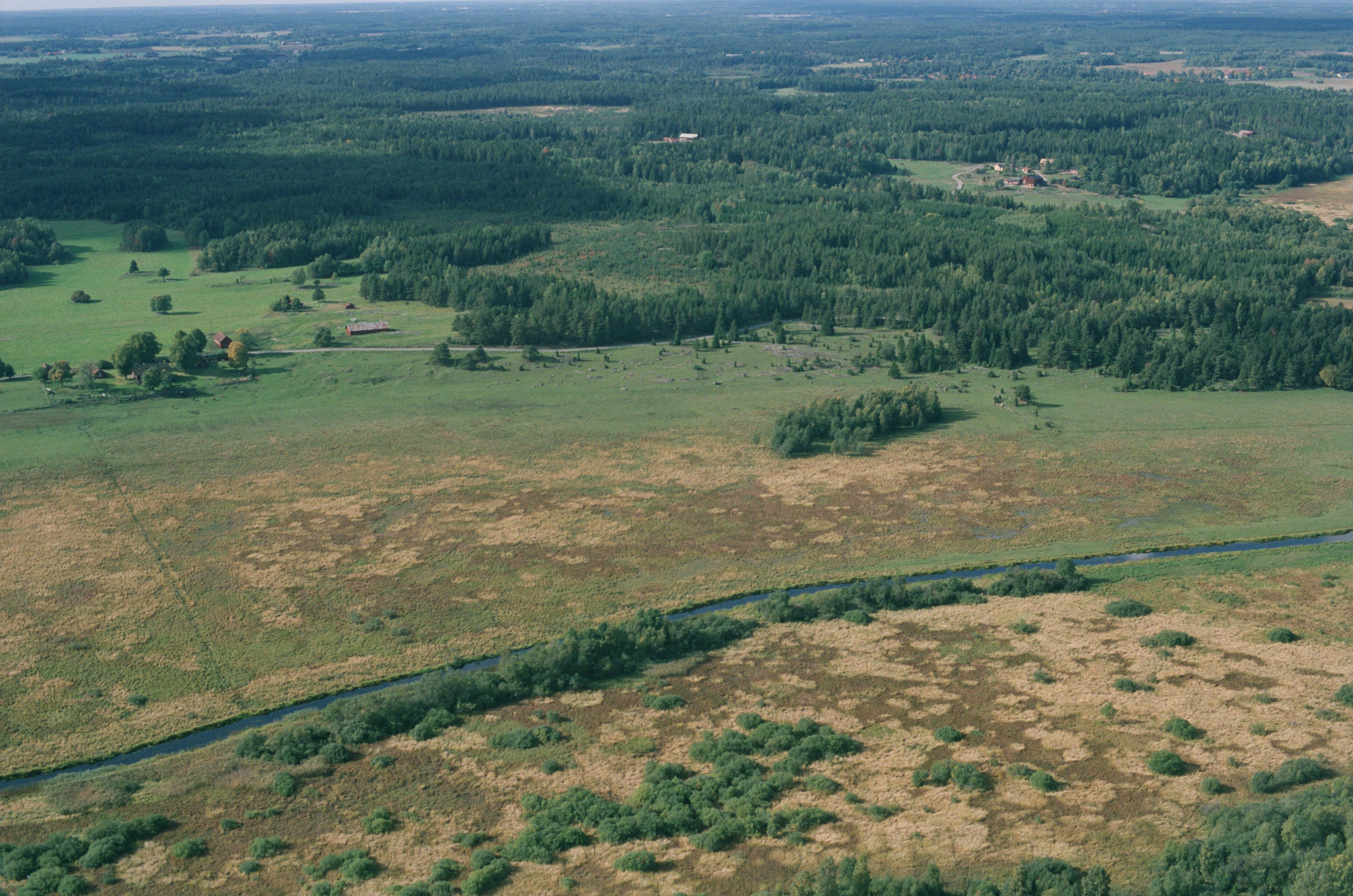 Beskrivning: Ängsmark vid Stora Benhamra gård i Långhundraleden och Helgöåns dalgång. Till höger om bildens mitt gravfält RAÄnr Vada 5:1. Bilden är tagen mot (väderstreck): VNV