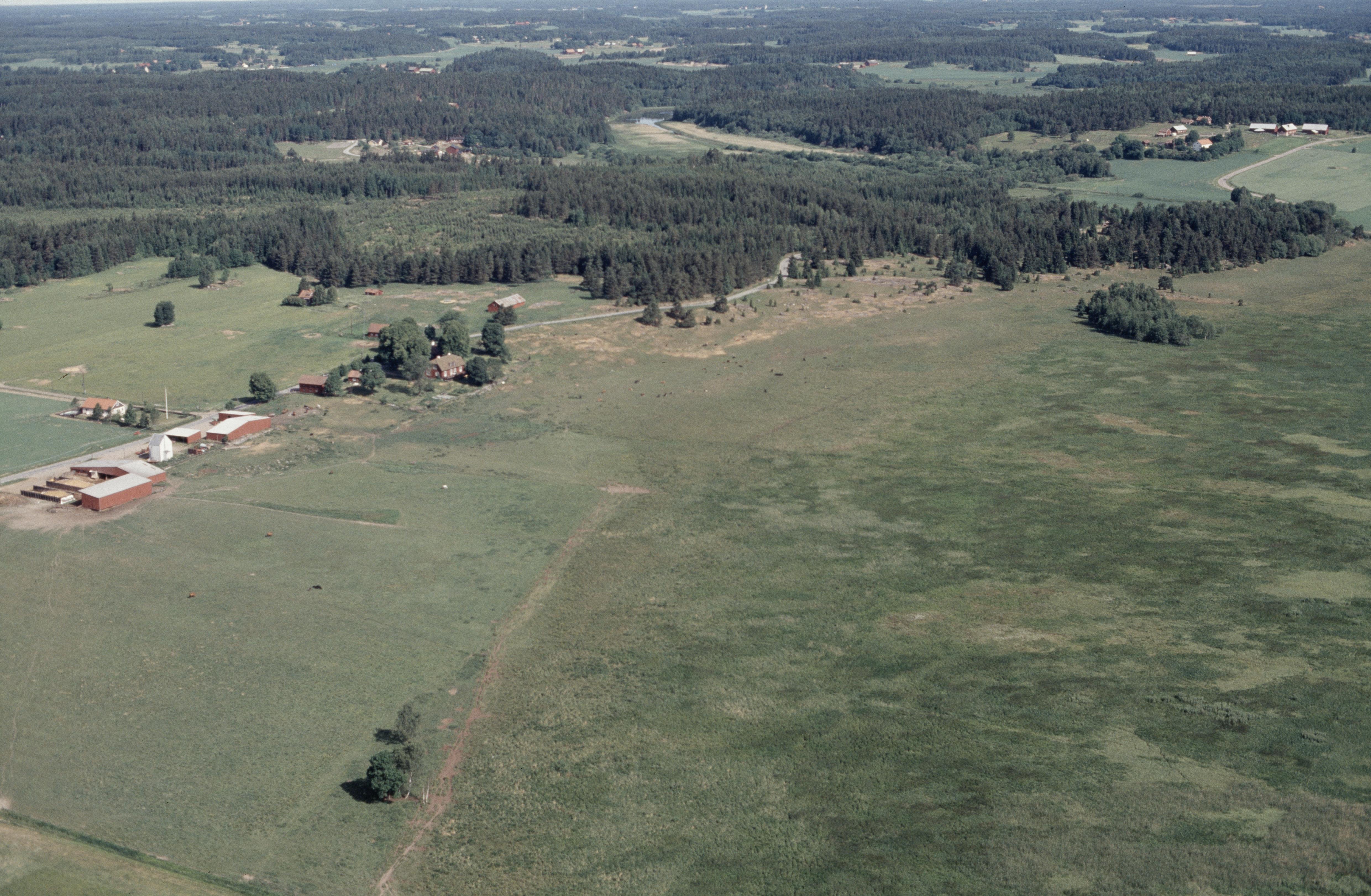 Beskrivning: Stora Benhamra gård i Långhundraleden och Helgöåns dalgång. Vid bildens mitt gravfält RAÄnr Vada 5:1. Bilden är tagen mot (väderstreck): NV