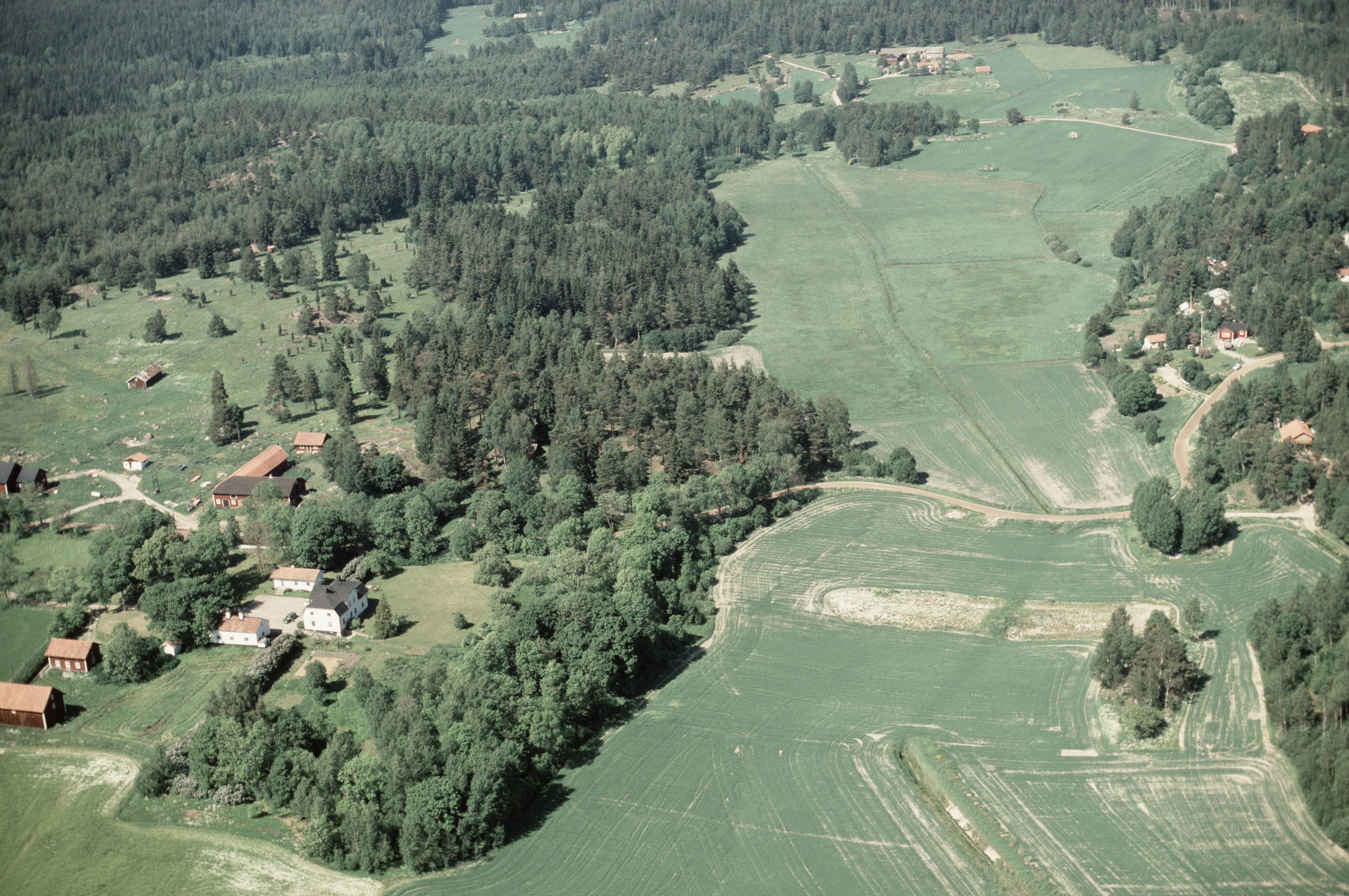 Beskrivning: Sydvästra delen av Angarnssjöängen, Långhundraleden. I bildens nedre del Lingsbergs by. Uppe till vänster fornborg RAÄnr Vallentuna 265:1. Till höger åker med runstenar (runstensbro) RAÄnr Vallentuna 257:1 m.fl. och gravfält RAÄnr Vallentuna 255:1. Bilden är tagen mot (väderstreck): N