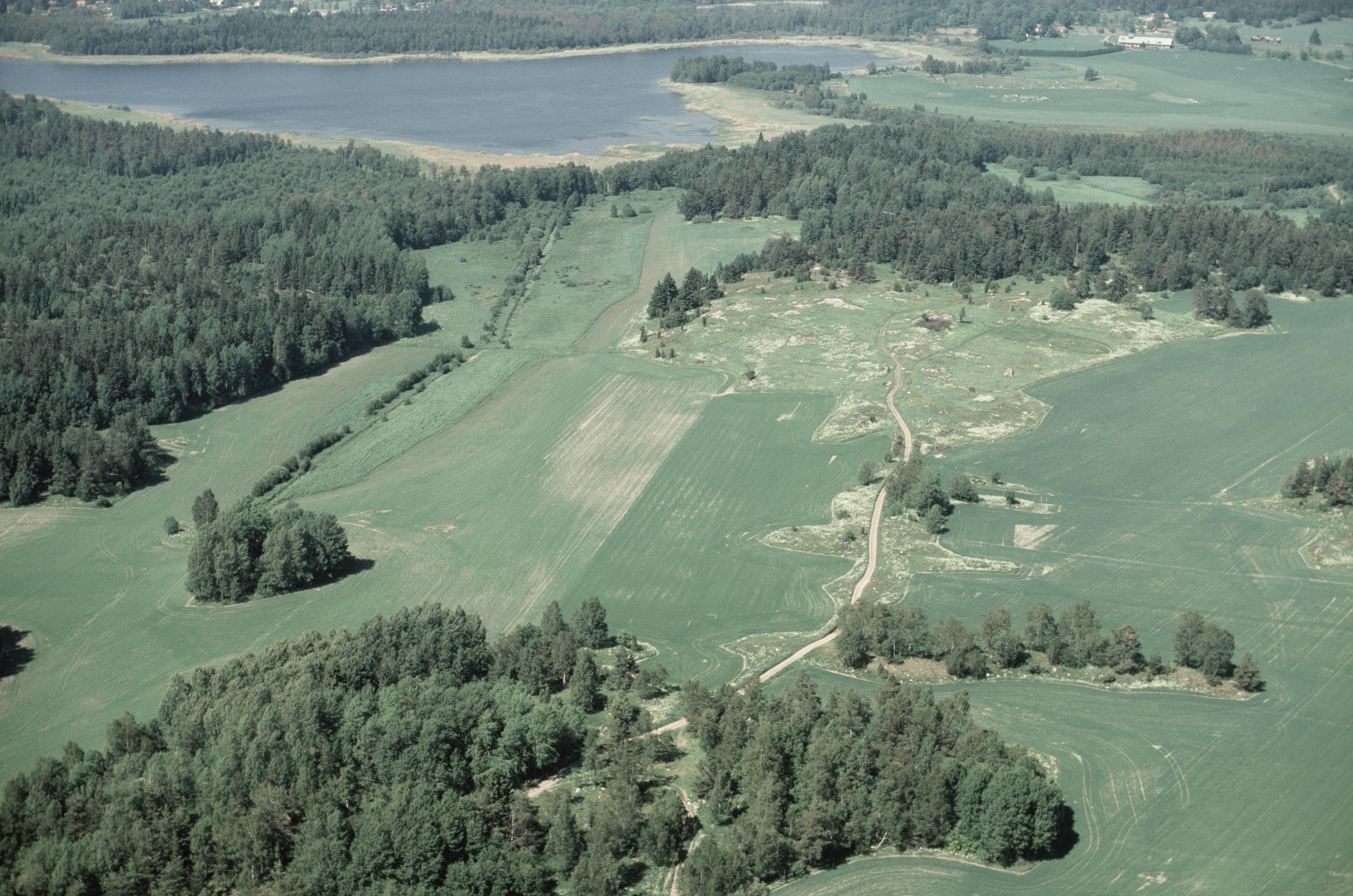 Beskrivning: Till höger över bildens mitt gravfält RAÄnr Vallentuna 302:1 vid gränsen mot Orkesta socken. Storsjön i bildens övre del. Uppe till höger Smedstorp i Orkesta socken. Bilden är tagen mot (väderstreck): NNV
