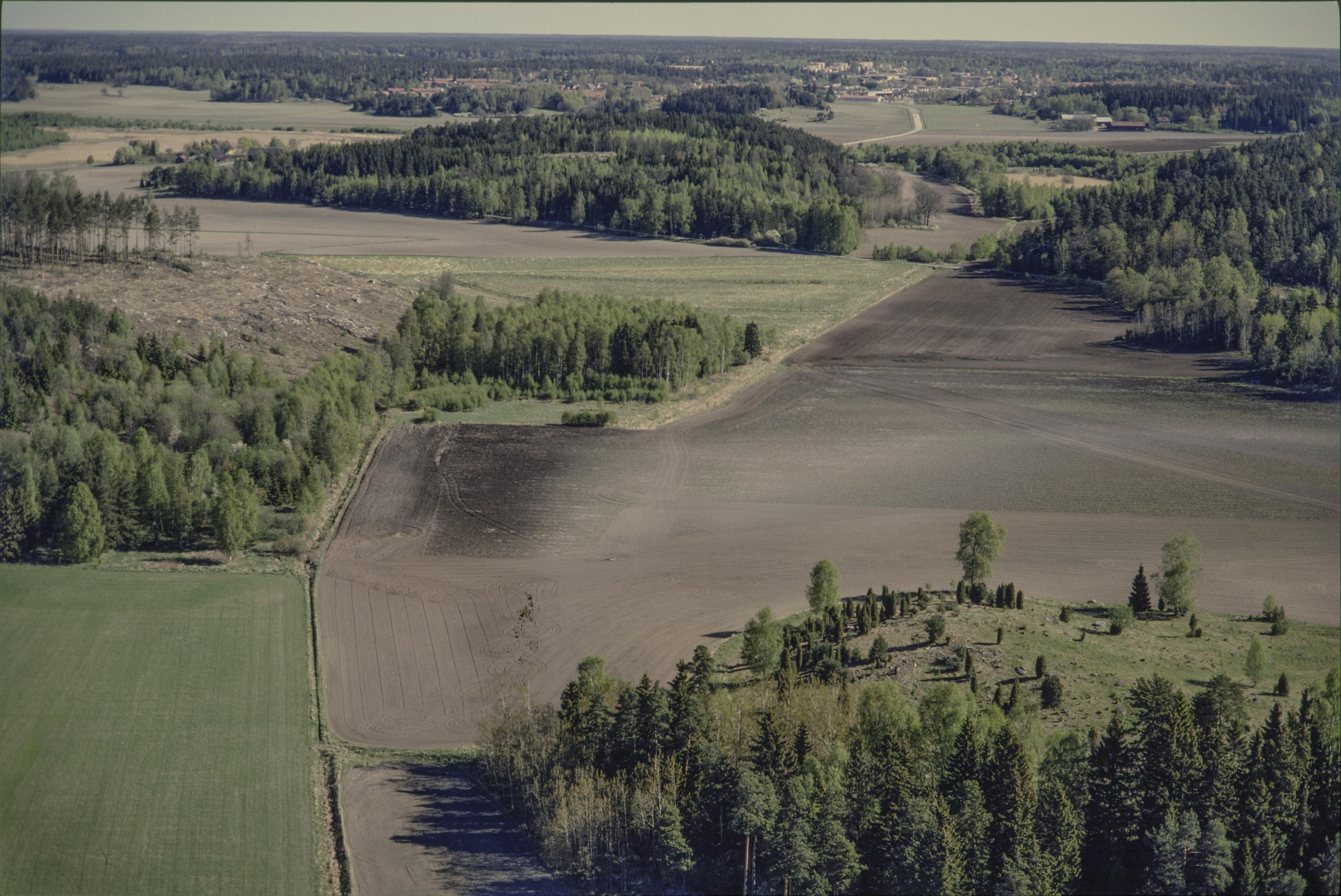 Beskrivning: Upplandsleden i området norr om Vickeby. Nere till höger runsten och bro RAÄnr Knivsta 131:1-2. I bildens nedre kant gränsen mot Vassunda socken. Bilden är tagen mot (väderstreck): NNO