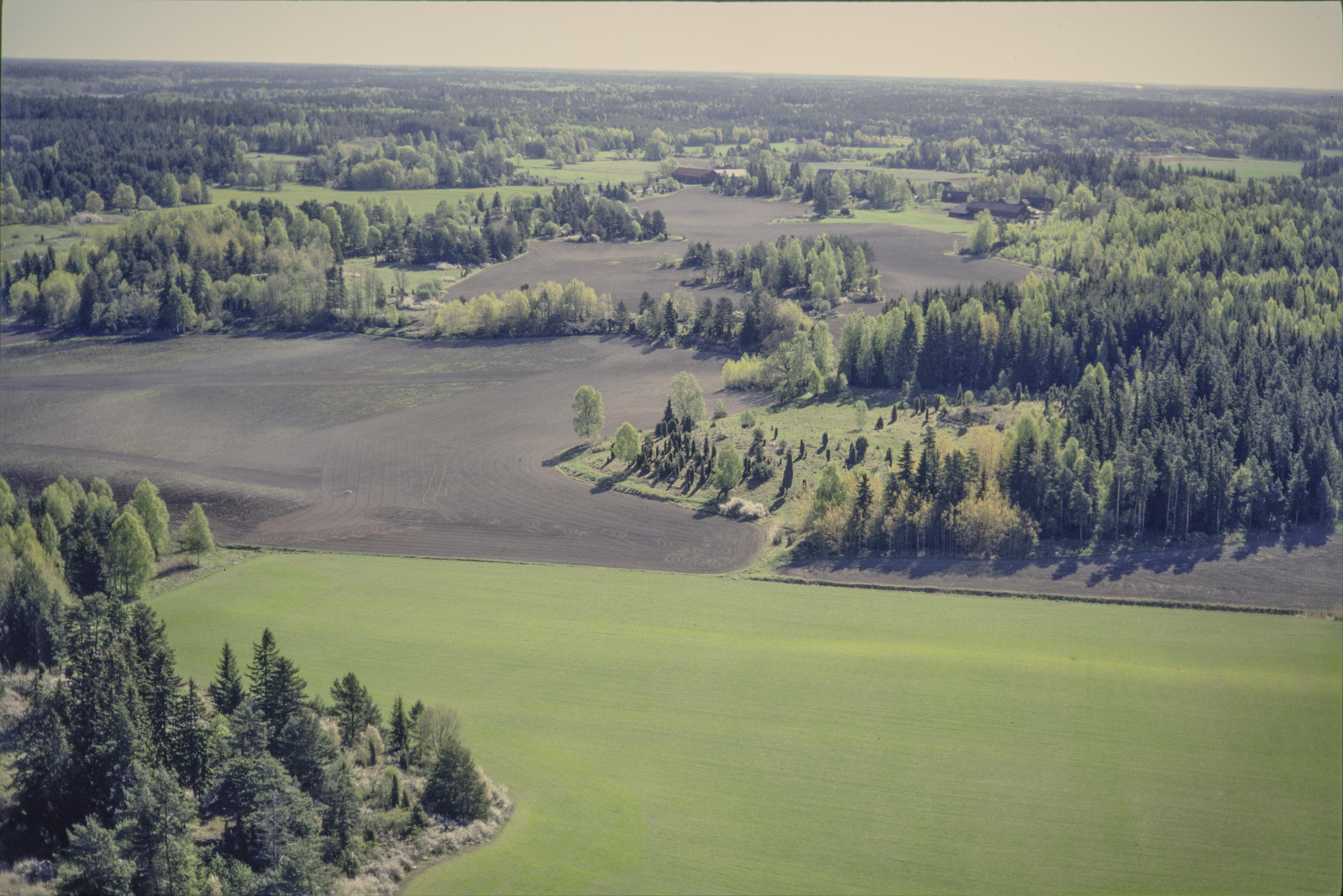 Beskrivning: Upplandsleden i området norr om Vickeby. Uppe till höger runsten och bro RAÄnr Knivsta 131:1-2. I bildens nedre del Vassunda socken. Bilden är tagen mot (väderstreck): Ö