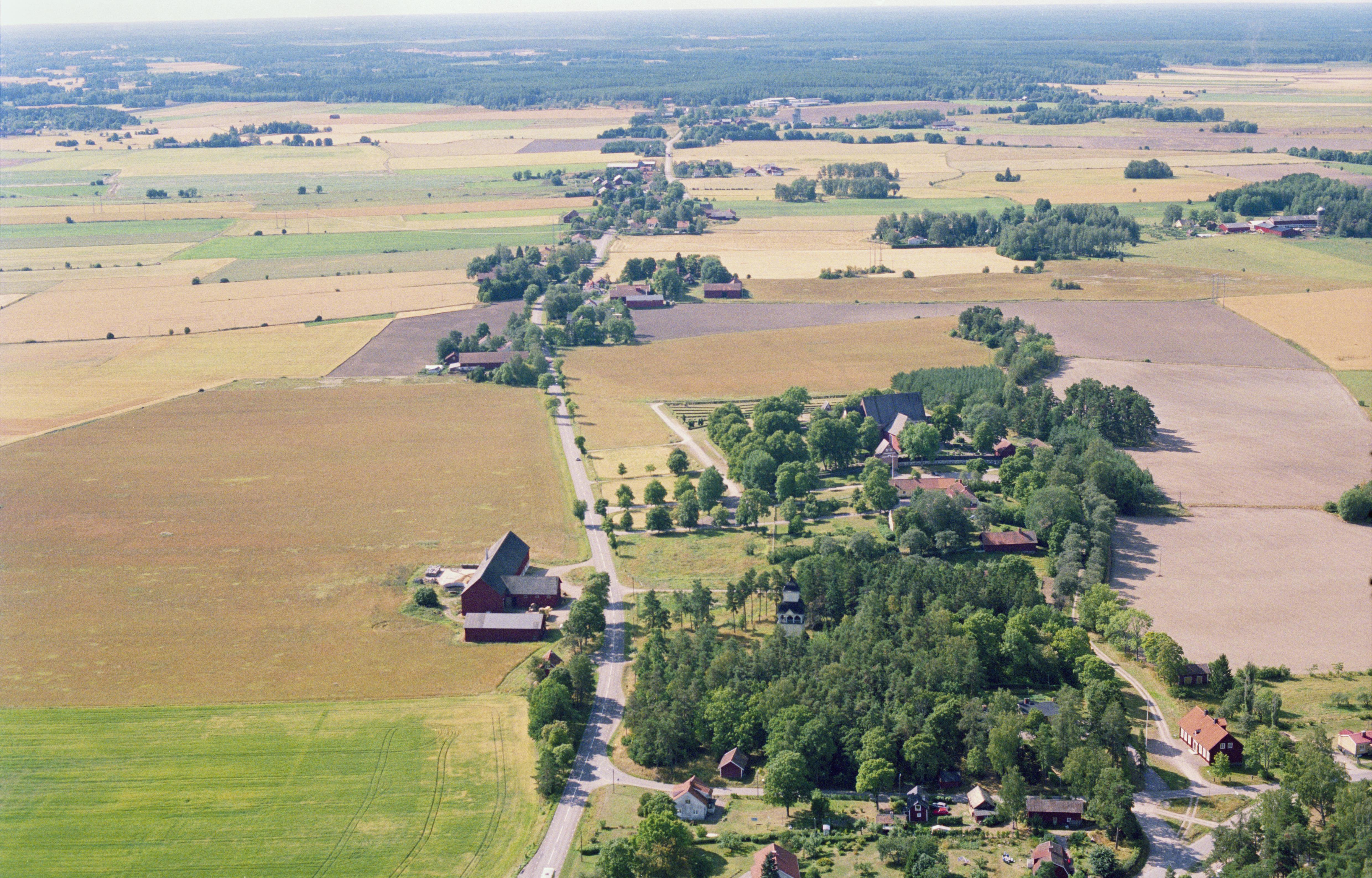Beskrivning: Vid bildens mitt Vendels prästgård och Vendels kyrka med minnesmärke och båtgravfält RAÄnr Vendel 9:1-2 m.fl. I bildens övre del byarna Allerbäcke, Karby och Husby. Bilden är tagen mot (väderstreck): SSV