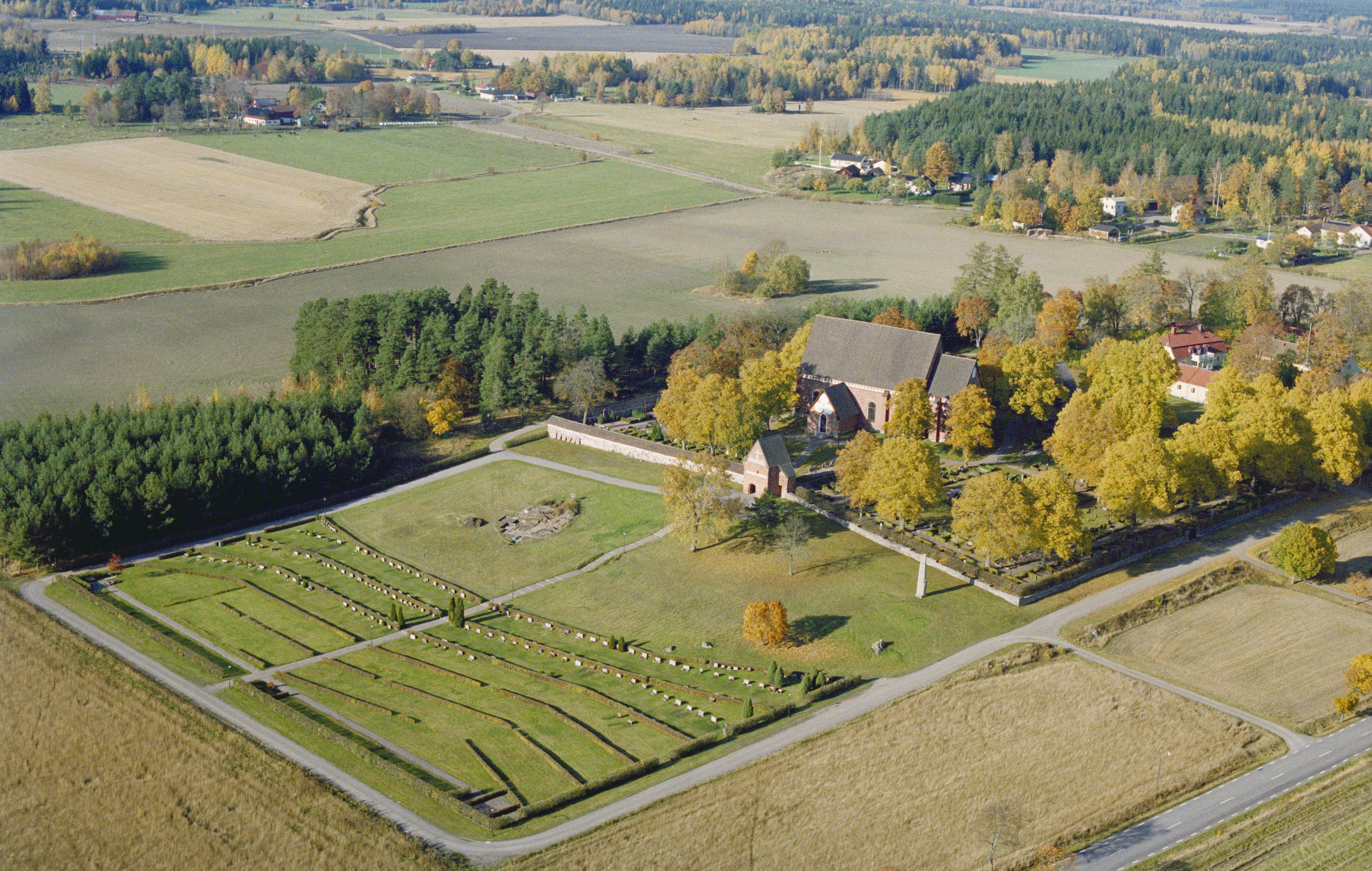 Beskrivning: Vid bildens mitt Vendels kyrka och Vendels prästgård. Under bildens mitt minnesmärke och båtgravfält RAÄnr Vendel 9:1-2. Holvarbo by m.fl. i bildens övre del. Bilden är tagen mot (väderstreck): N