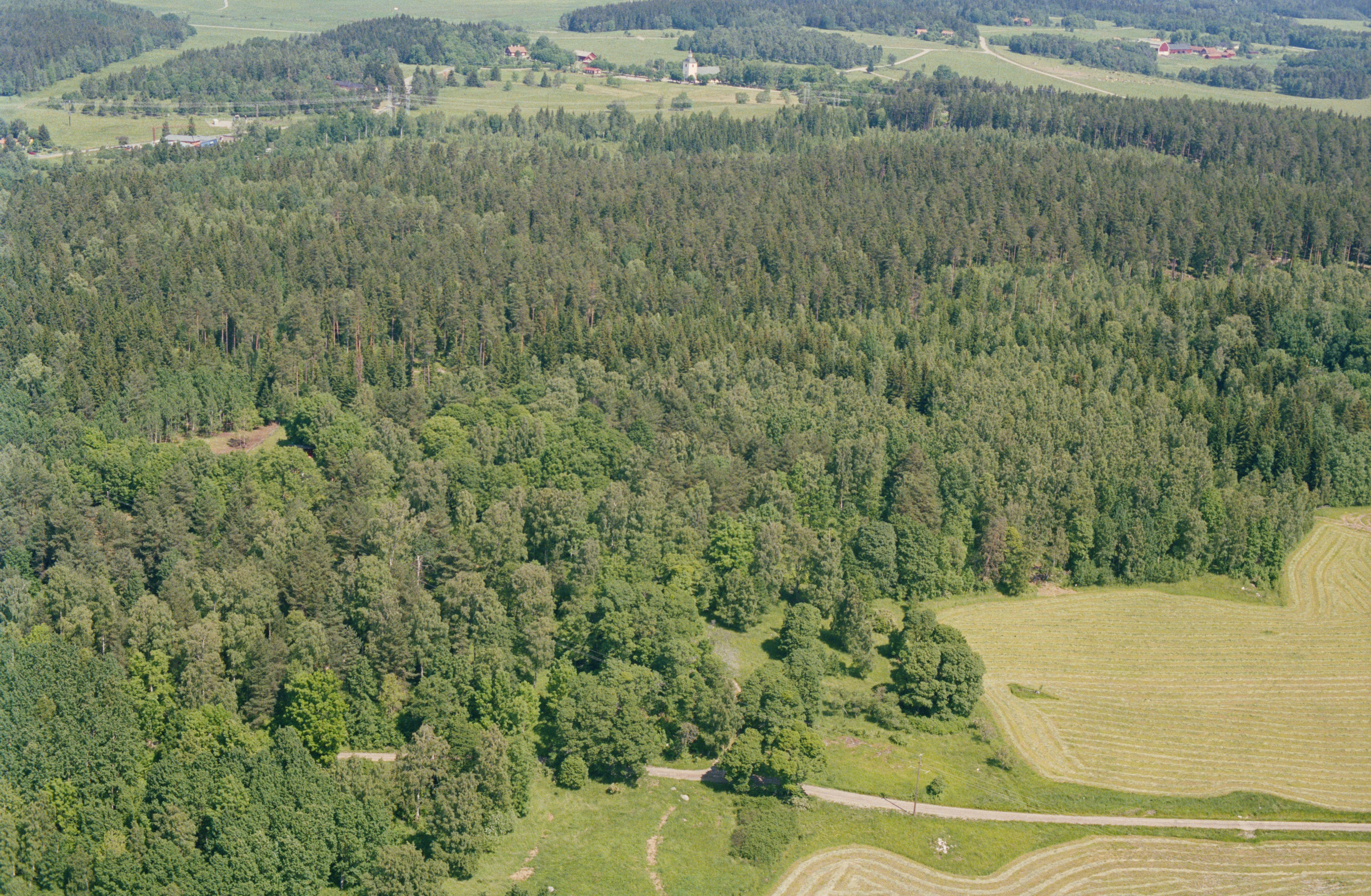 Beskrivning: Tibble gamla tomt RAÄnr Västra Ryd 105:1 och Tibble gravfält RAÄnr Västra Ryd 18:1. I bildens övre del Västra Ryds kyrka och kyrkby. Bilden är tagen mot (väderstreck): NNO