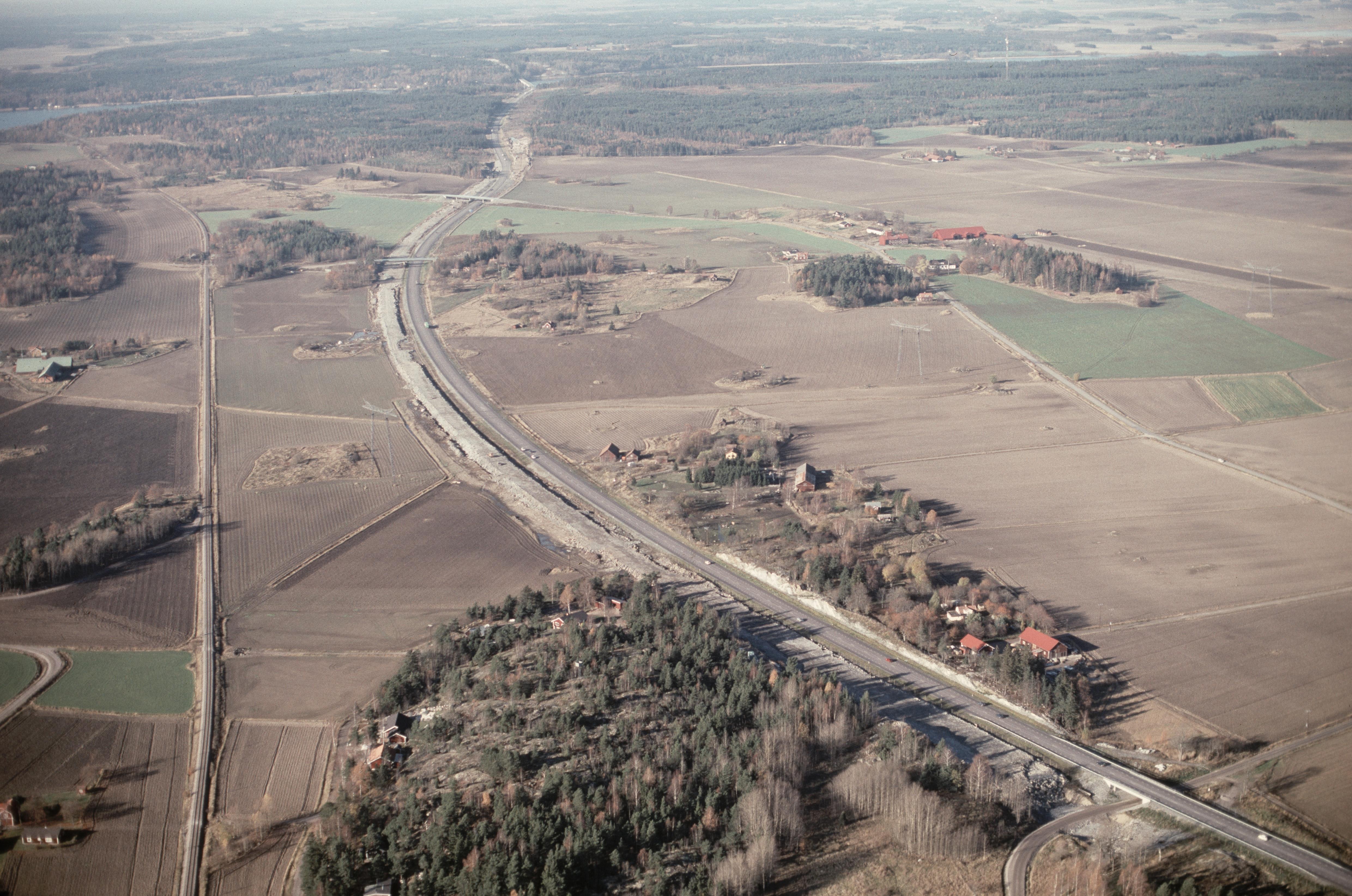 Beskrivning: Arkeologiska undersökningar innan bygge av väg E18 vid Apalle, Högsta och Pollista. Till vänster över bildens mitt gravfält Dragonbacken och Pollista gamla tomt RAÄnr Övergran 228:1, gravfält Övergran 9:1-4, hällristningar Övergran 281:1-3 m.m. Yttergrans socken nere till höger. Bilden är tagen mot (väderstreck): NV