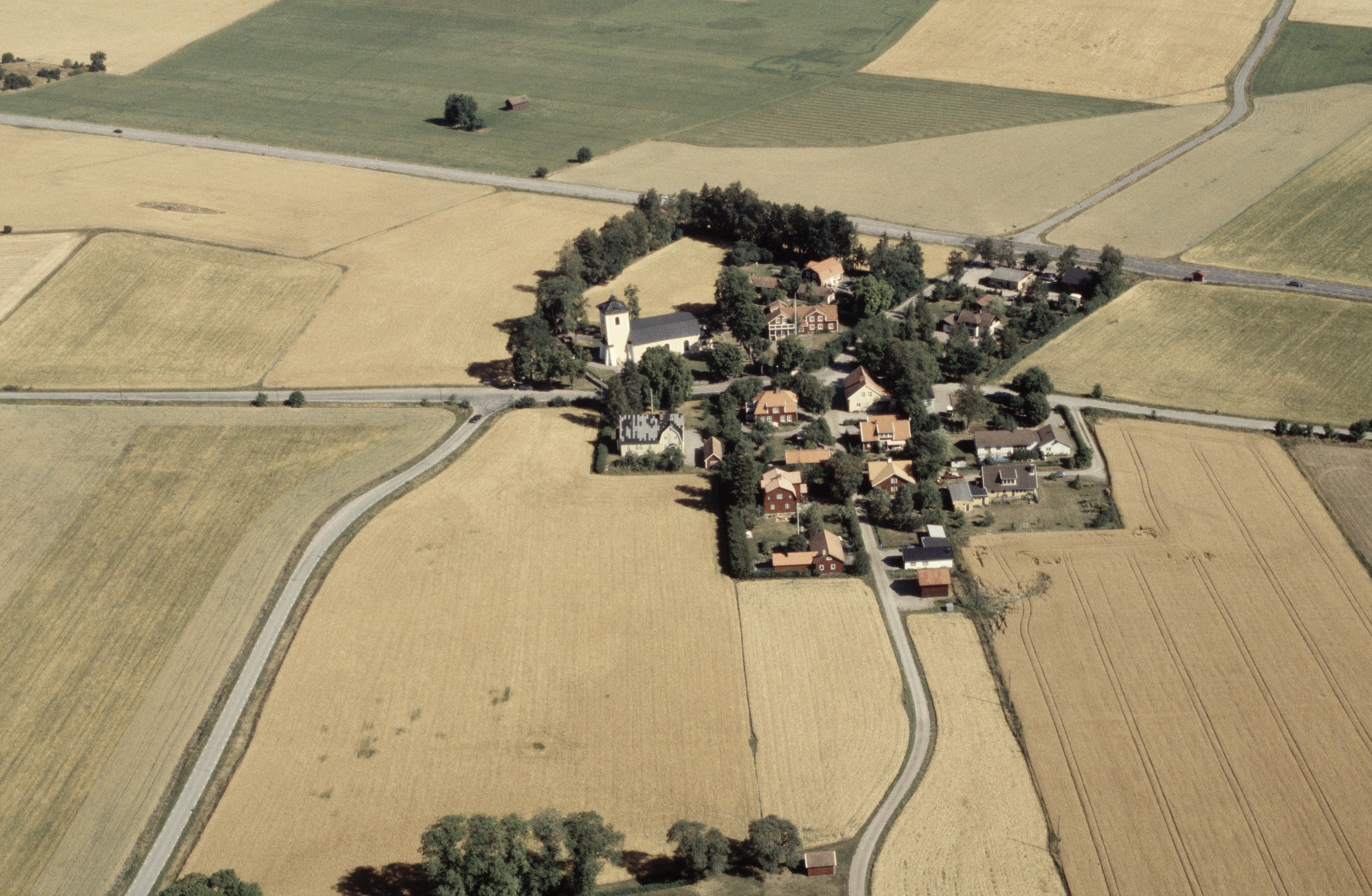 Beskrivning: Åkerby kyrka och kyrkby. Vid kyrkan kapelllämning RAÄnr Åkerby 46. Bilden är tagen mot (väderstreck): NNO