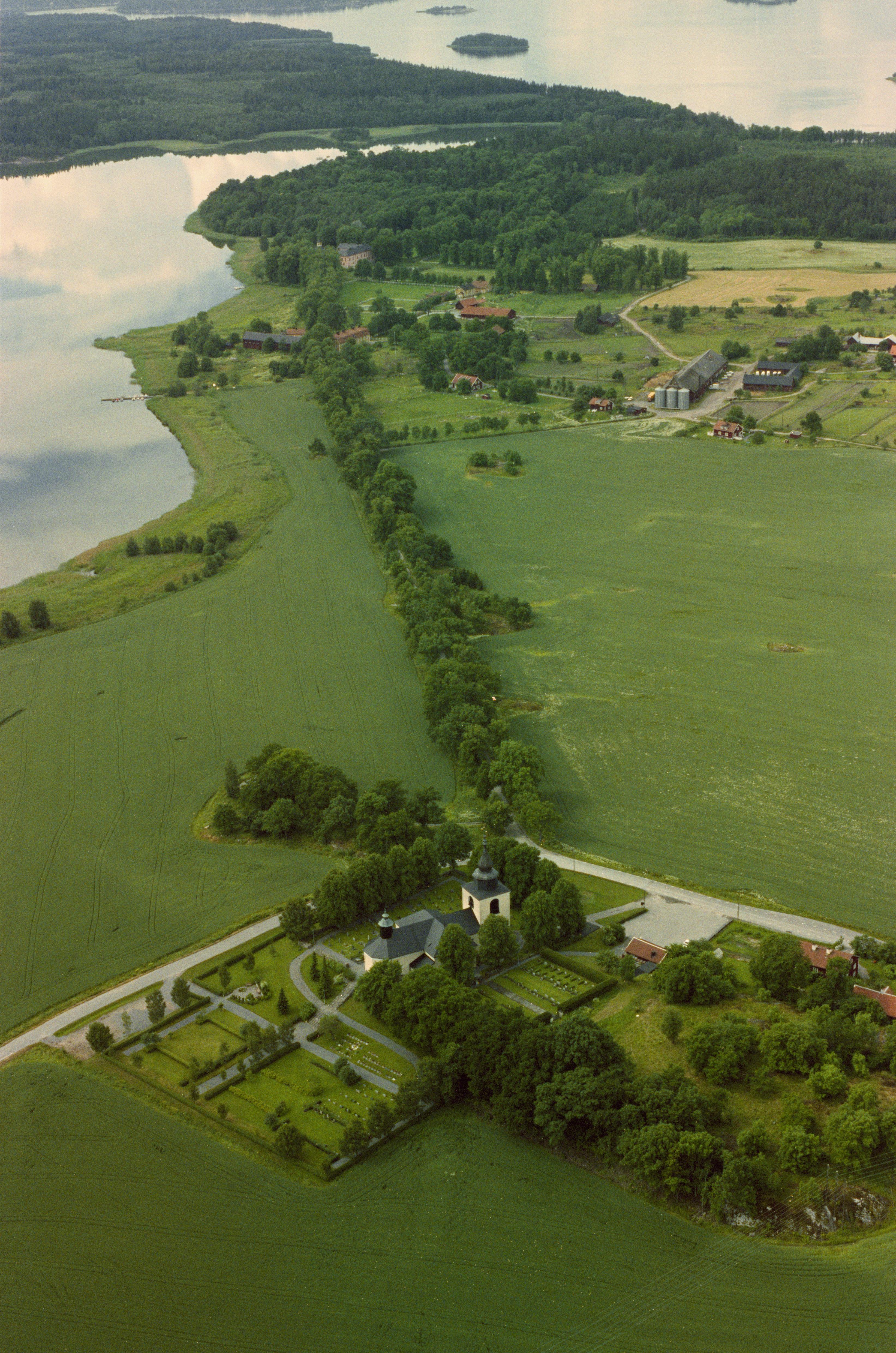 Beskrivning: Östra Ryds kyrka. I bildens övre del Rydboholms slott med Vasatornet - byggnadsminne RAÄnr Östra Ryd 70:1. Kyrkfjärden till vänster och fjärden Stora Värtan uppe till höger. Bilden är tagen mot (väderstreck): SV