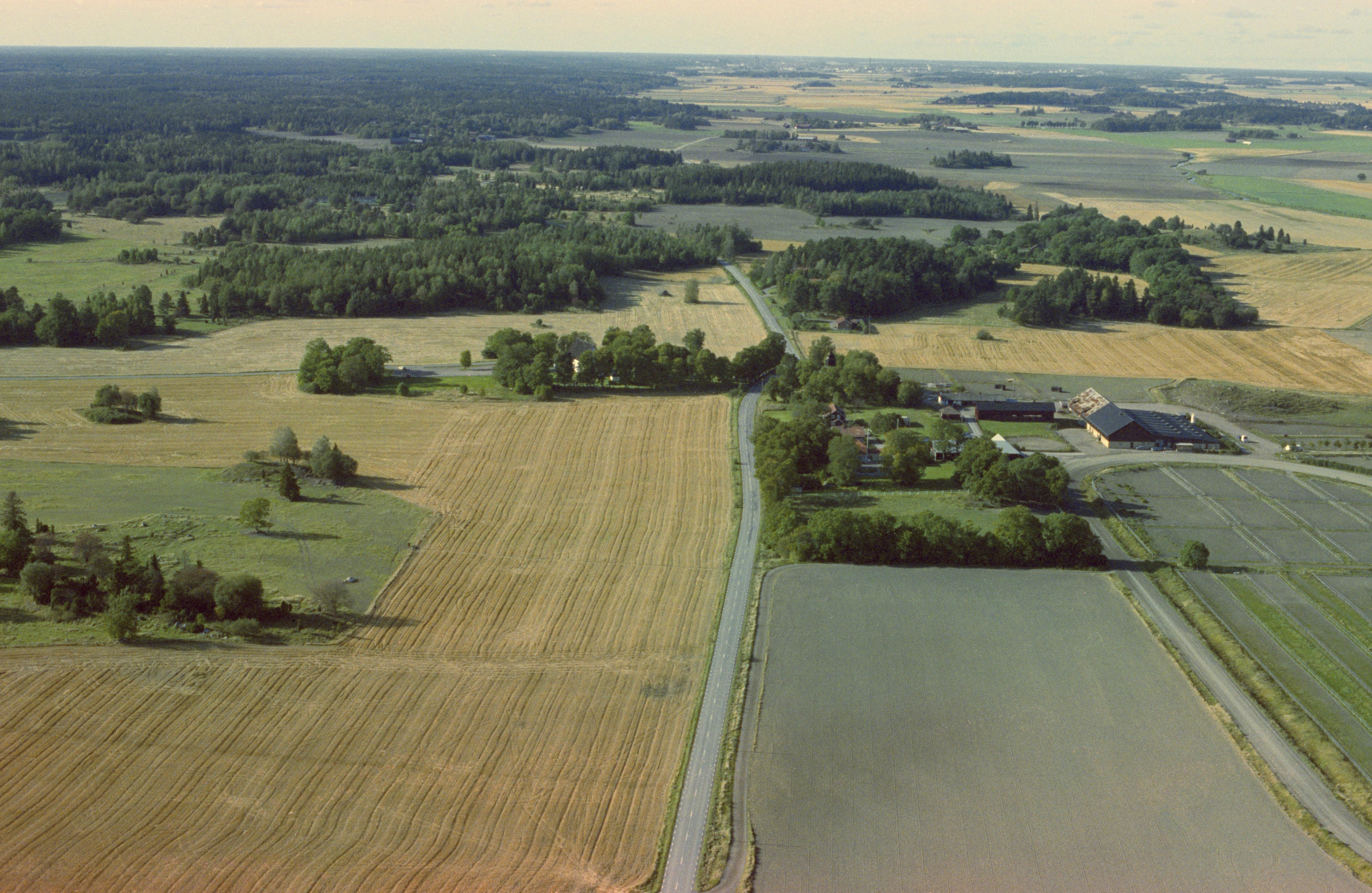 Beskrivning: Östuna kyrka till vänster över bildens mitt. Bilden är tagen mot (väderstreck): VNV