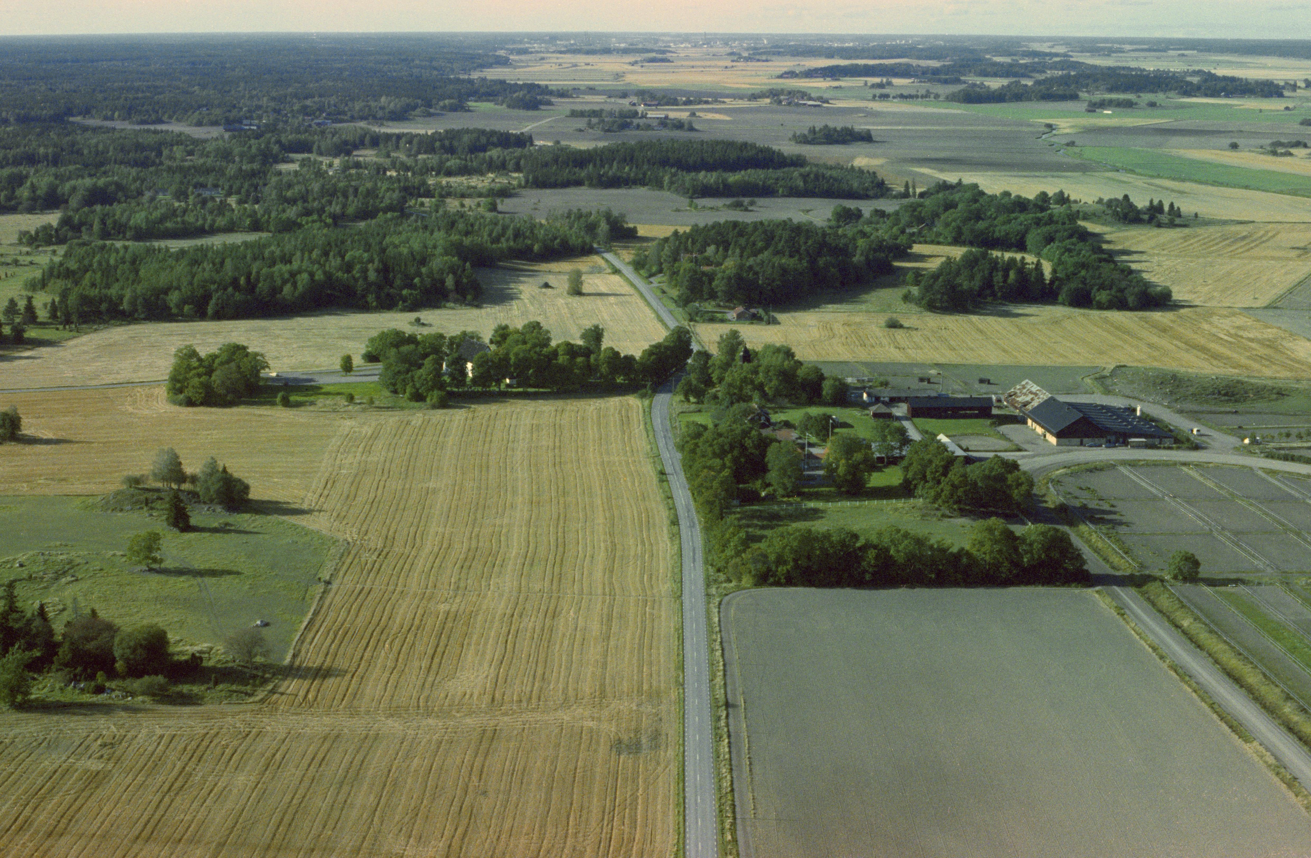 Beskrivning: Östuna kyrka till vänster över bildens mitt. Bilden är tagen mot (väderstreck): VNV