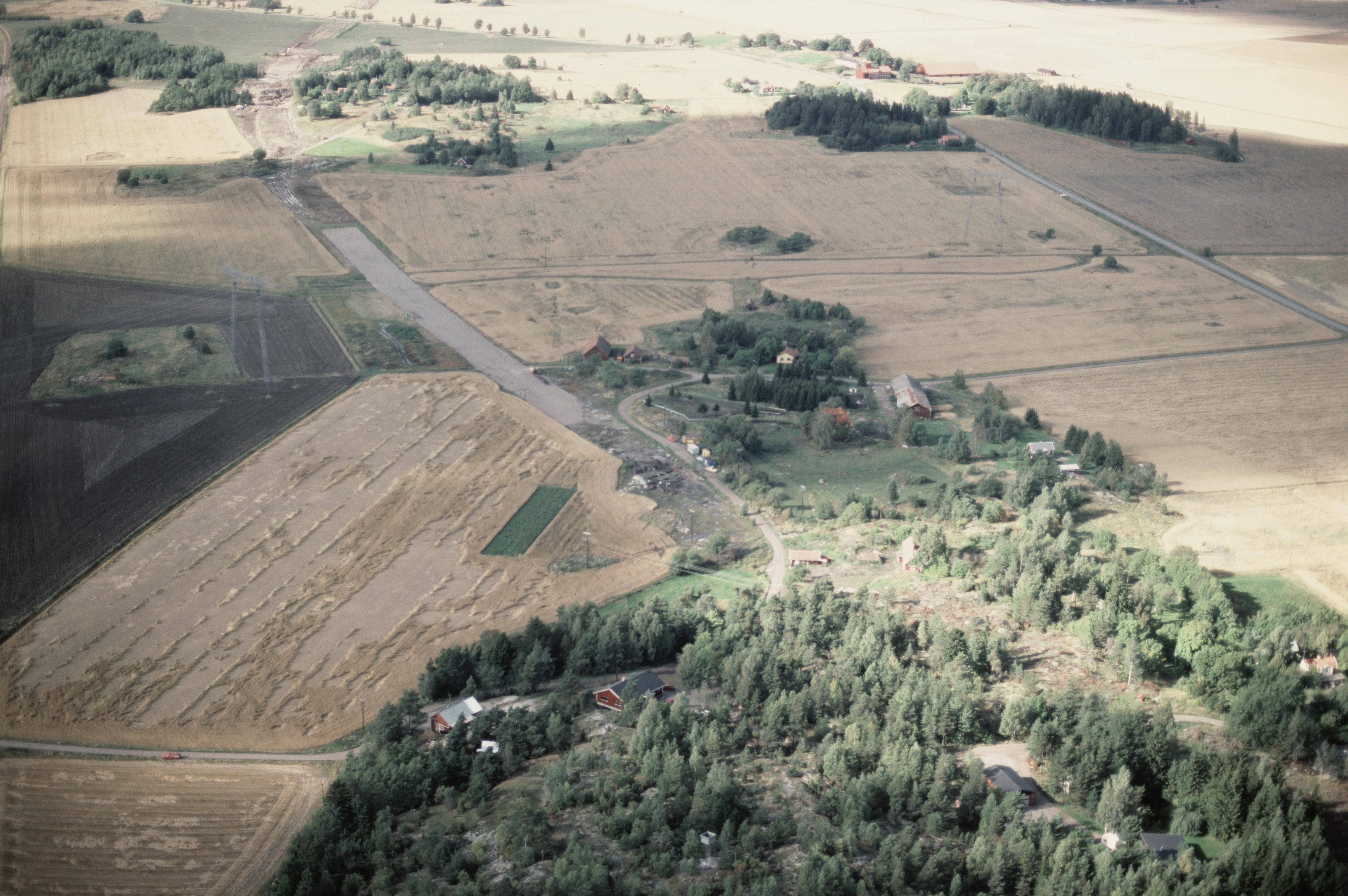 Beskrivning: Arkeologiska undersökningar innan bygge av väg E18 vid Apalle, Högsta och Pollista. Fornlämningsområde med bo- och gravplatser, hällristningar och bytomt RAÄnr Övergran 260:1-3 m.fl. I bildens övre del Högsta gamla tomt, gravfält Dragonbacken och Pollista gamla tomt RAÄnr Övergran 228:1. Bilden är tagen mot (väderstreck): VNV