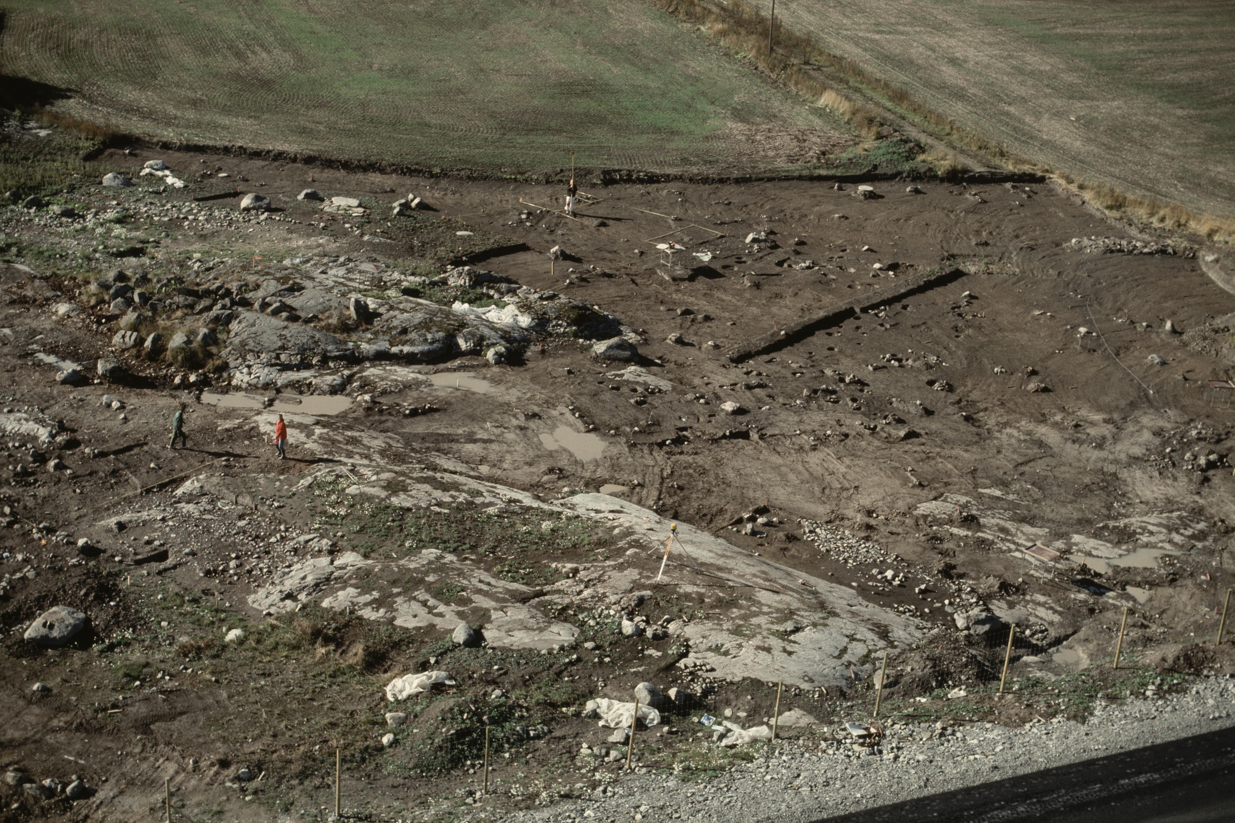 Beskrivning: Arkeologiska undersökningar innan bygge av väg E18 vid Apalle, Högsta och Pollista. I bilden västra delen av Pollista gamla tomt RAÄnr Övergran 228:1. Bilden är tagen mot (väderstreck): S