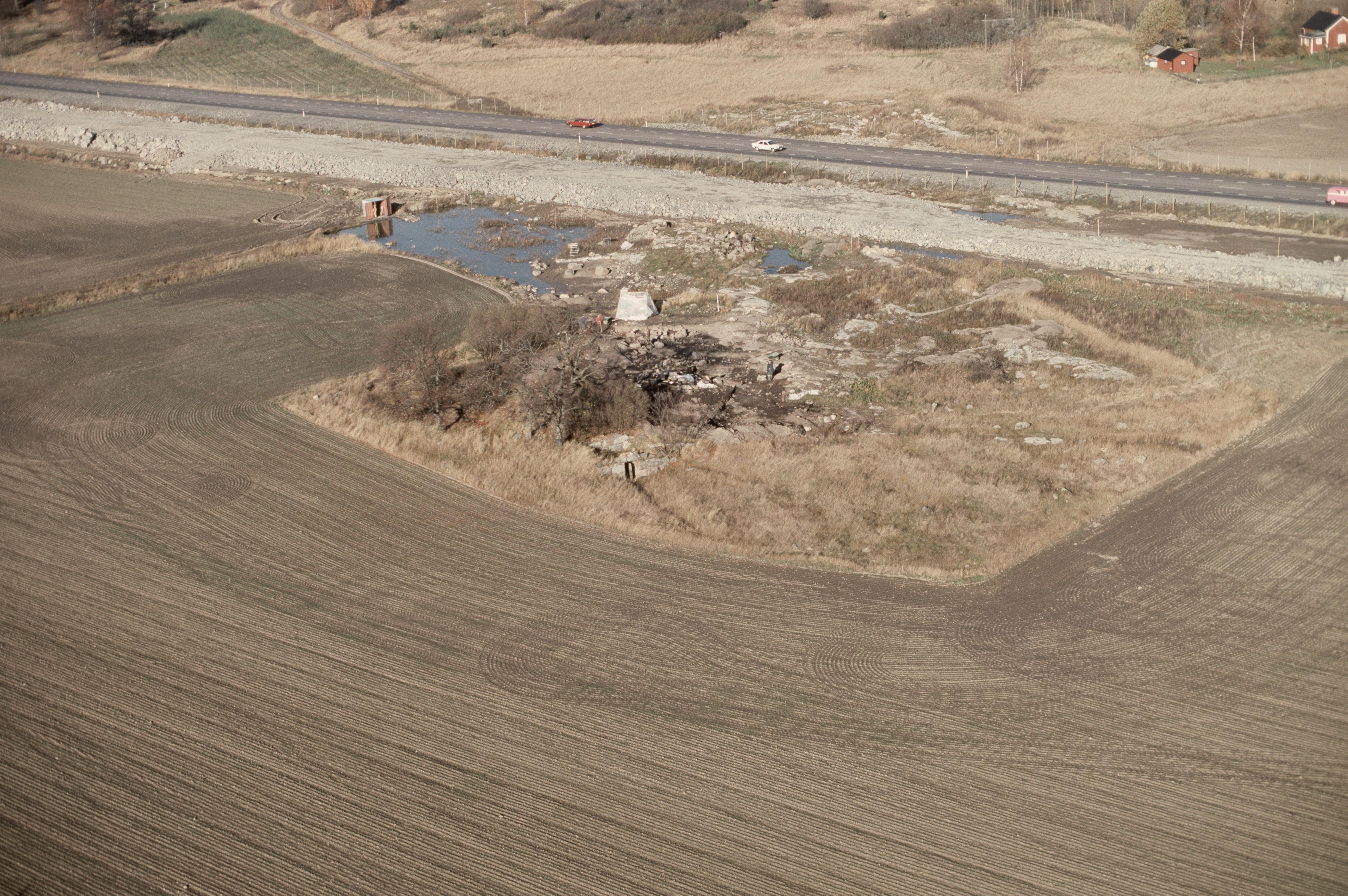 Beskrivning: Arkeologiska undersökningar innan bygge av väg E18 vid Apalle, Högsta och Pollista. Vid bildens mitt Pollista gamla tomt RAÄnr Övergran 228:1. Bilden är tagen mot (väderstreck): N
