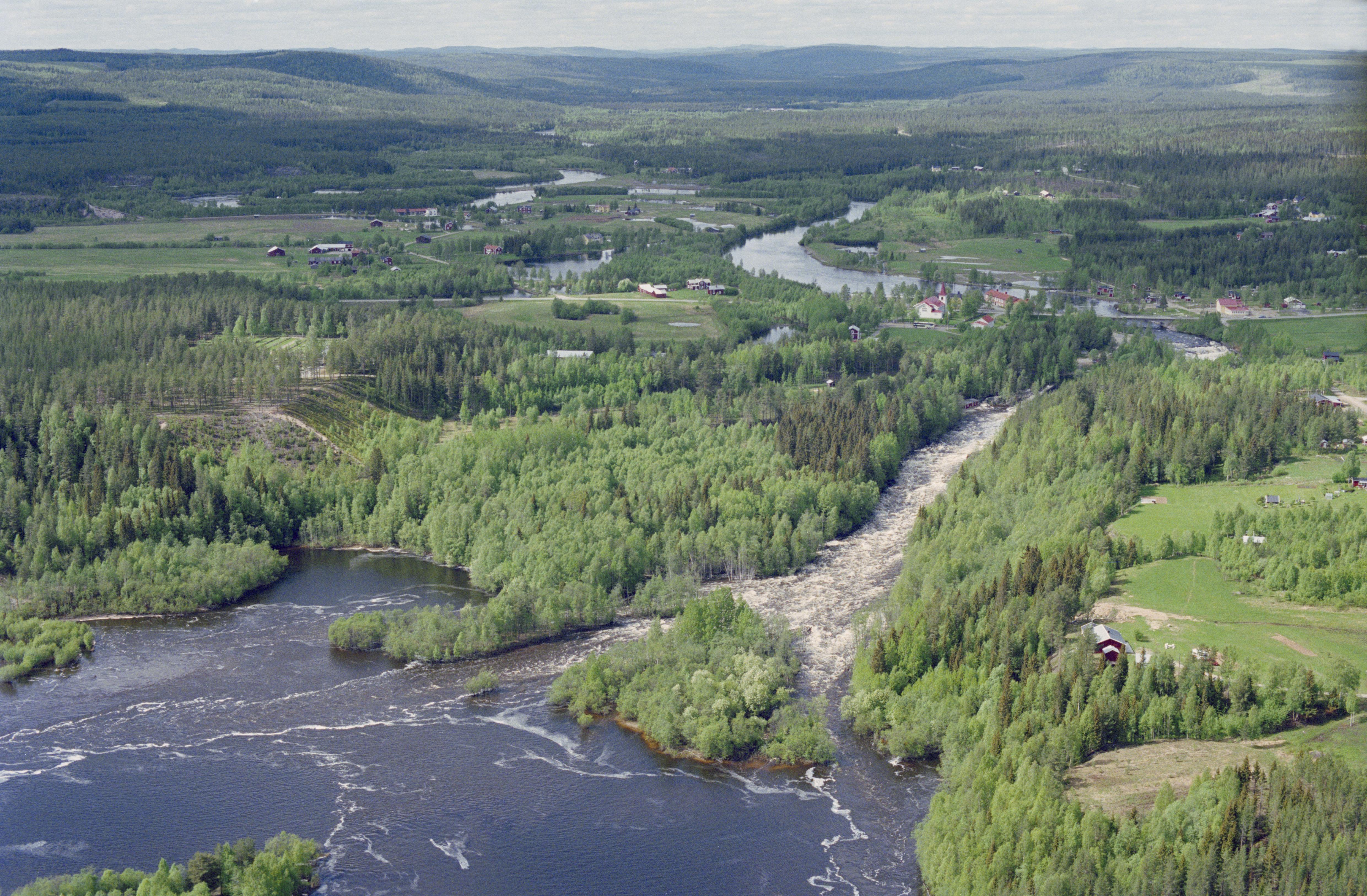 Beskrivning: Byskeälven vid Fällfors kyrkby. Fällfors kyrka till höger om bildens mitt. På Stödmyran vid bildens mitt fornlämningsplatsen RAÄnr Byske 912:1. Bilden är tagen mot (väderstreck): NV