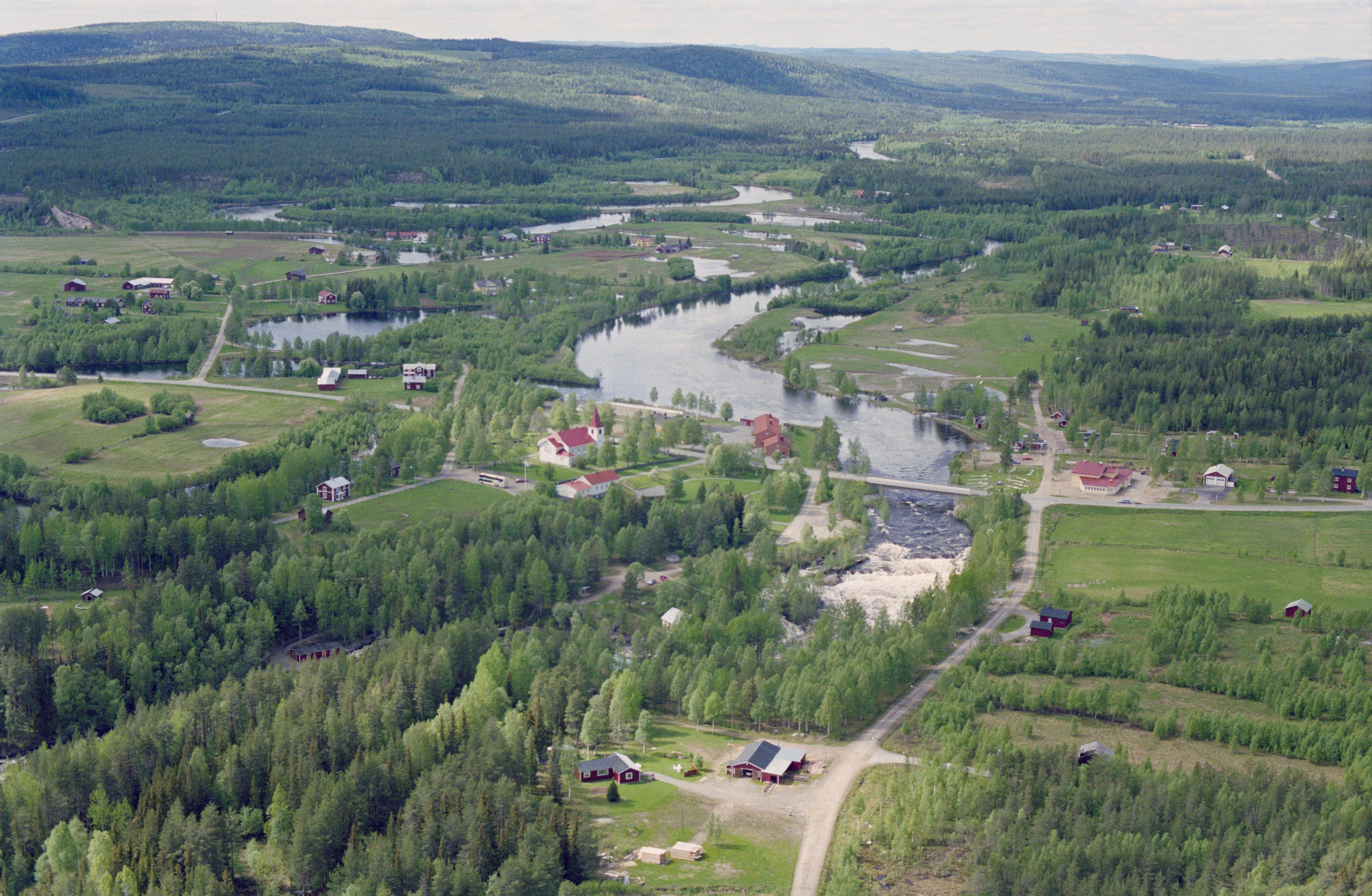 Beskrivning: Byskeälven vid Fällfors kyrkby. Fällfors kyrka till vänster om bildens mitt. Vid älvkanten över bildens mitt fornlämningsplatsen / båtlänning RAÄnr Byske 600:1. Bilden är tagen mot (väderstreck): VNV