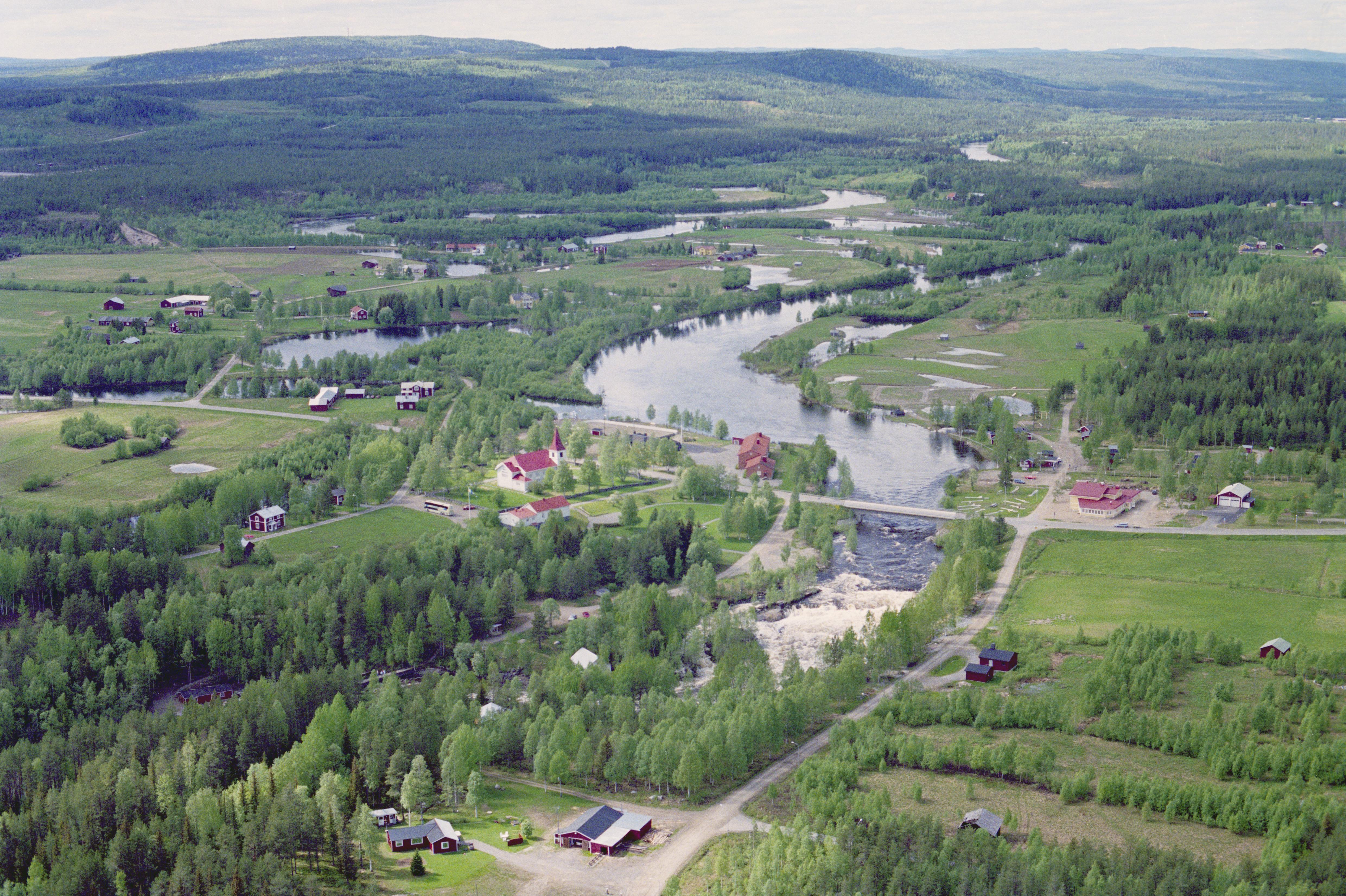Beskrivning: Byskeälven vid Fällfors kyrkby. Fällfors kyrka till vänster om bildens mitt. Vid älvkanten över bildens mitt fornlämningsplatsen / båtlänning RAÄnr Byske 600:1. Bilden är tagen mot (väderstreck): VNV