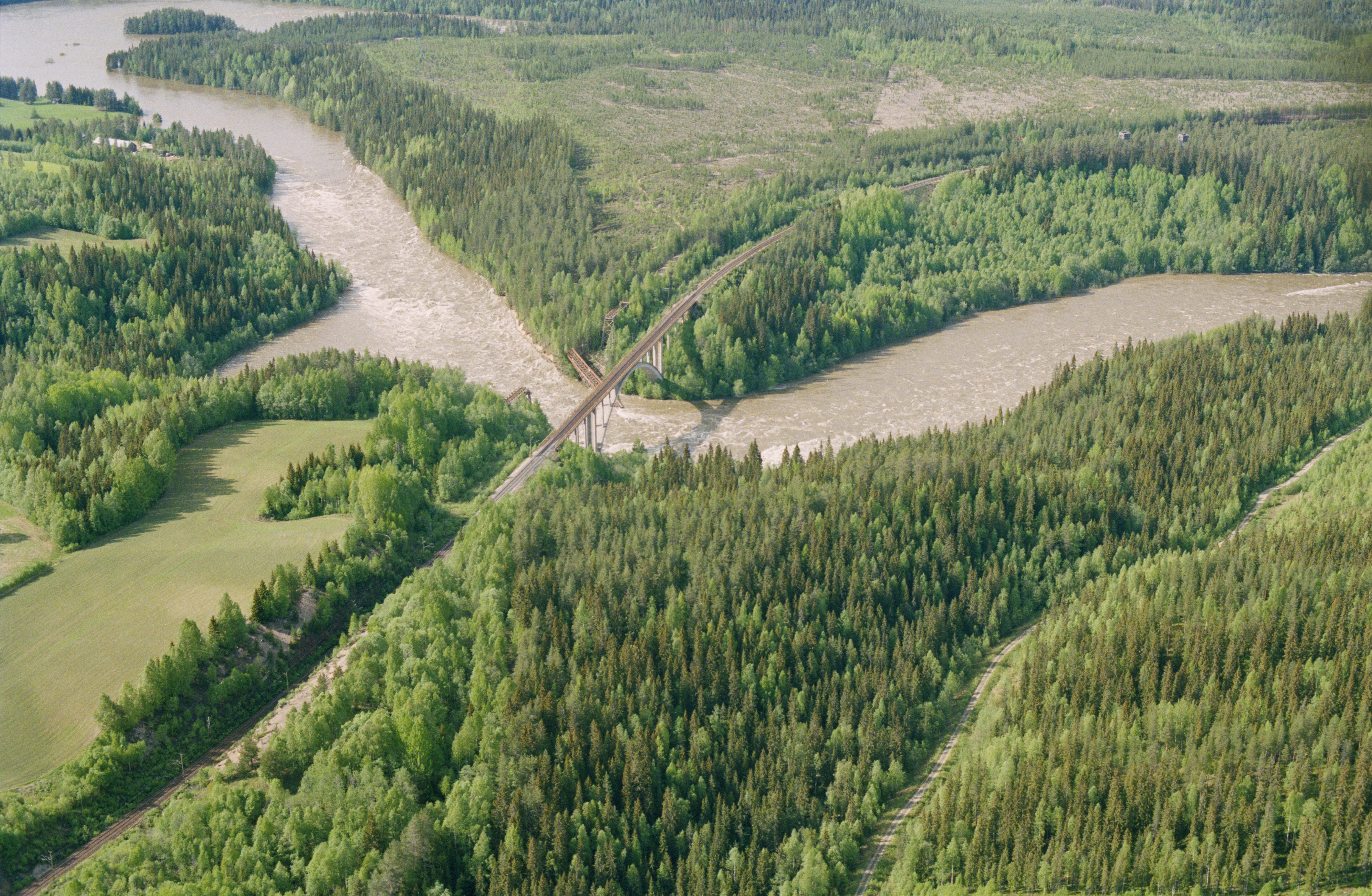 Beskrivning: Vindelälvens dalgång söder om tätorten Vindeln. Vid bildens mitt nya och gamla järnvägsbron över Kvarnforsen. Den gamla bron är här skadat efter en kraftig vårflod våren 1995. I bildens övre del boplats RAÄnr Degerfors 1201. Bilden är tagen mot (väderstreck): NV