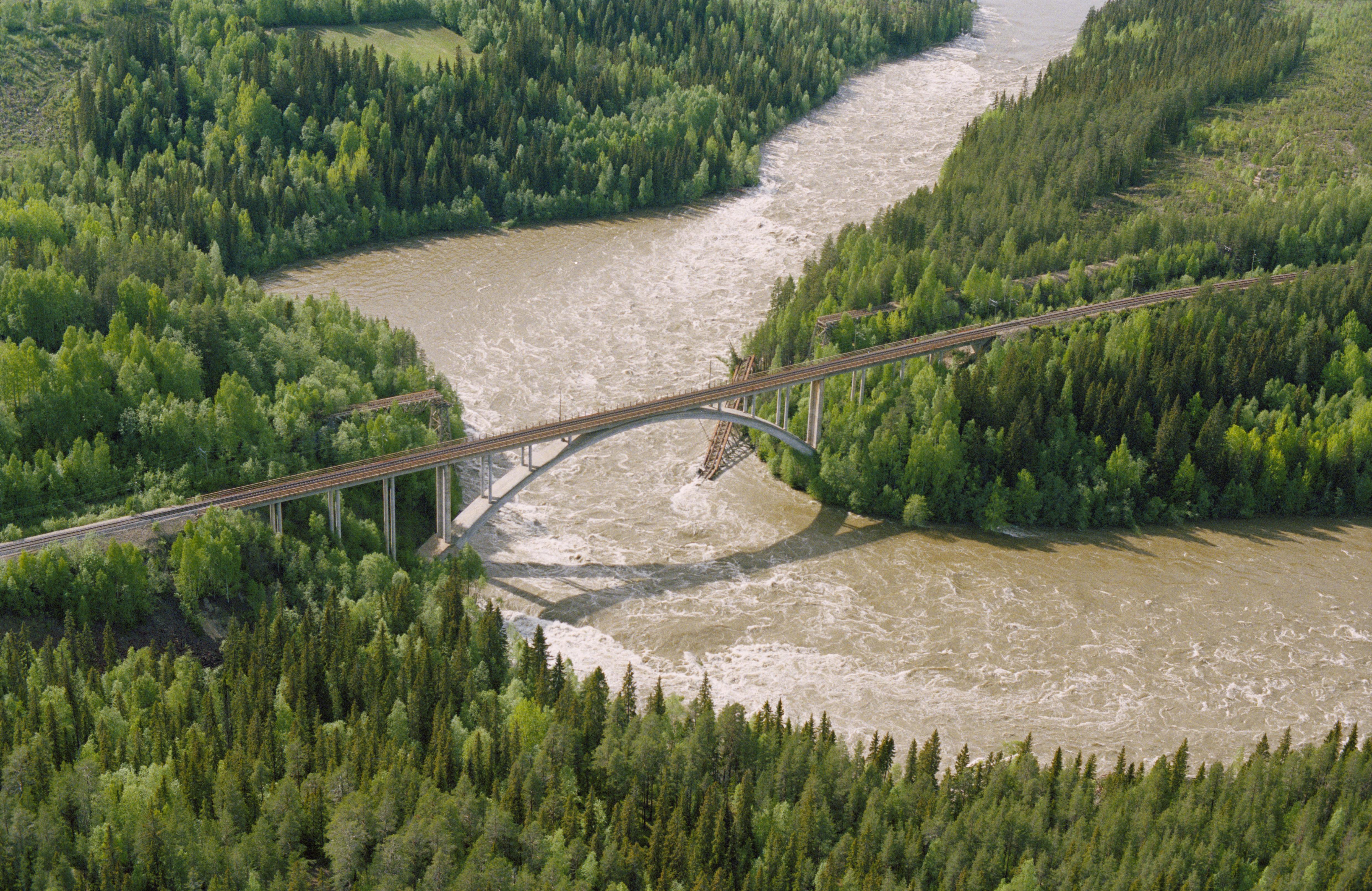 Beskrivning: Vindelälvens dalgång söder om tätorten Vindeln. Nya och gamla järnvägsbron över Kvarnforsen. Den gamla bron är här skadat efter en kraftig vårflod våren 1995. Till höger i bildens övre del boplats RAÄnr Degerfors 1201. Bilden är tagen mot (väderstreck): V