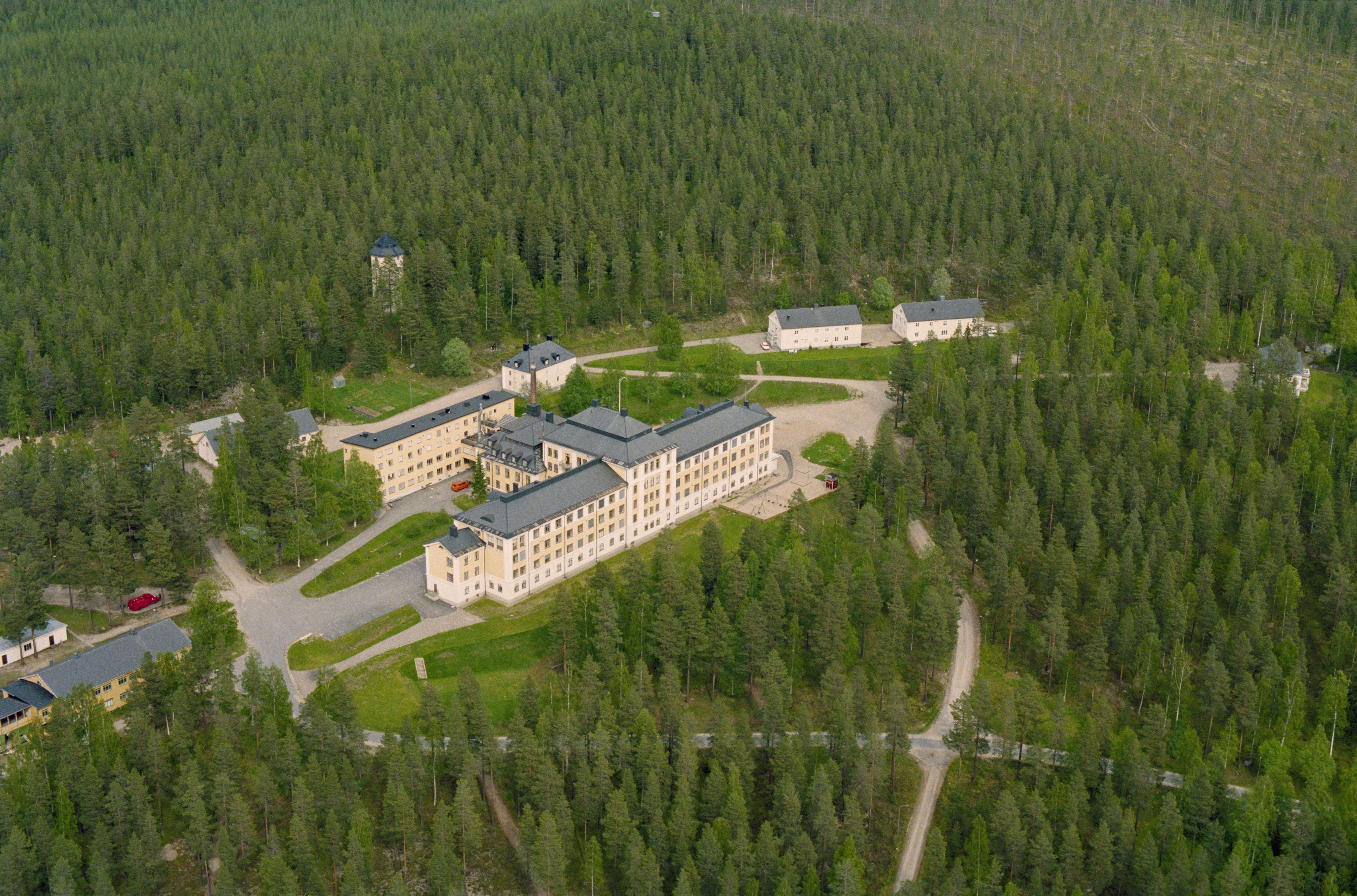 Beskrivning: Vindelälvens dalgång. Hällnäs sanatorium i norra delen av Hällnäs tätort. I skogen över sanatoriet fångstgrop RAÄnr Degerfors 51:1. Bilden är tagen mot (väderstreck): ONO