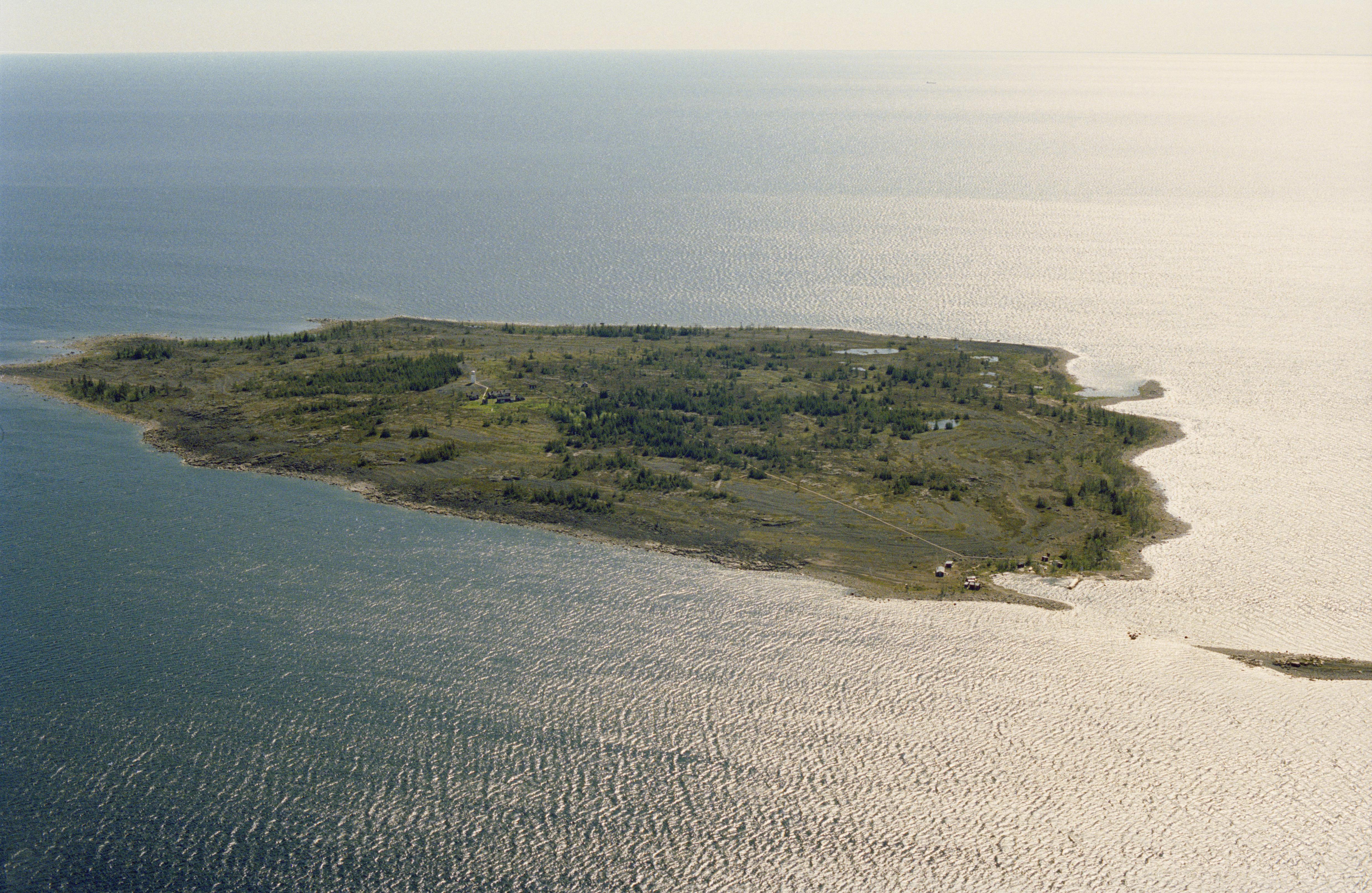 Beskrivning: Ön Stor-Fjäderägg (skrivs även Stora Fjäderägg). Vid bildens mitt fyrplats RAÄnr Holmön 28:1. På ön även flera labyrinter. Stor-Fjäderägg ingår i ögruppen Holmöarna i sundet Norra Kvarken. Bilden är tagen mot (väderstreck): OSO