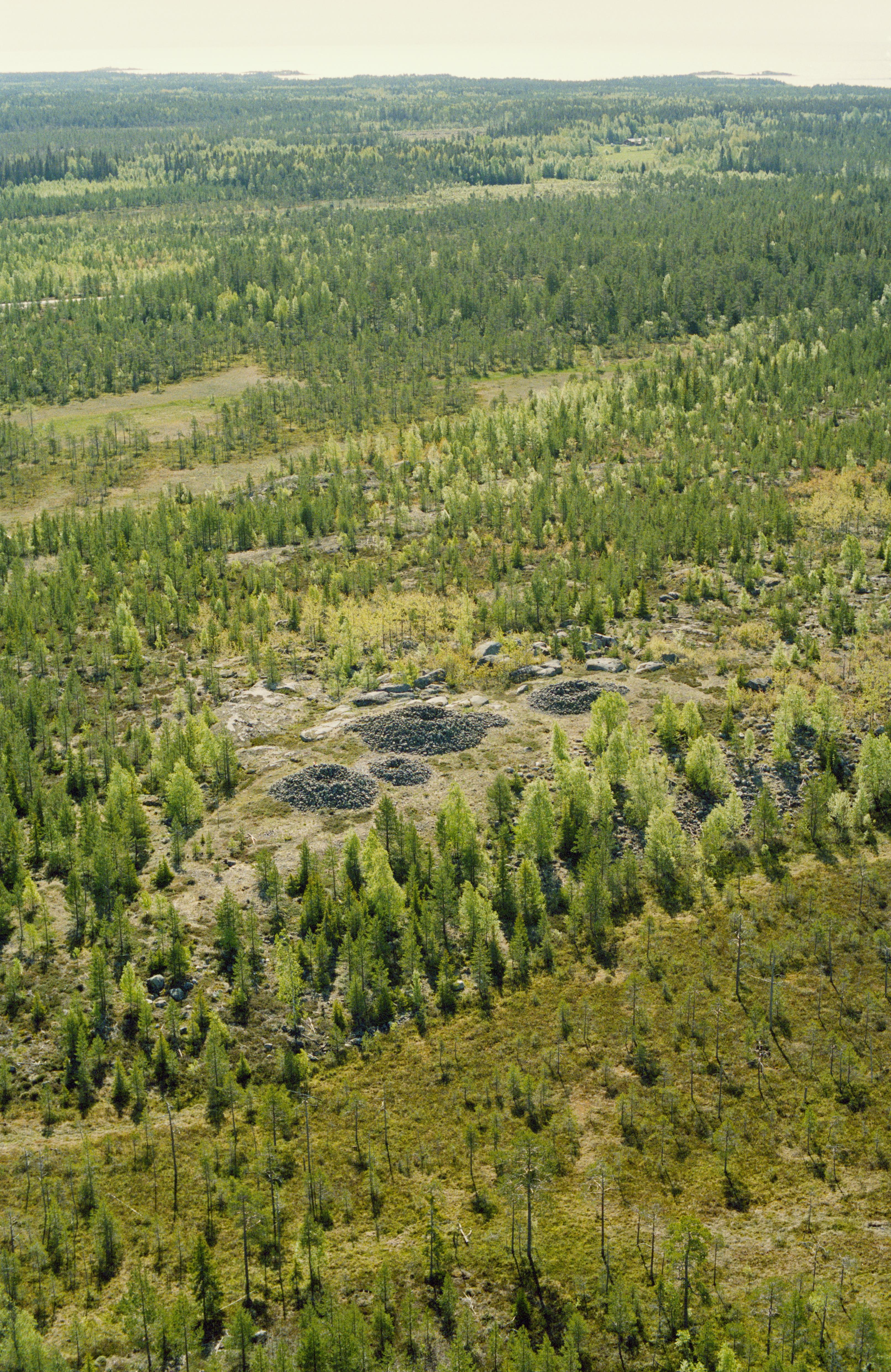 Beskrivning: Fisksjömyran vid bildens mitt. Under bildens mitt Röseberget (skrivs även Rösberget) med gravrösen och stensättningar RAÄnr Umeå stad 44:1, 45:1, 46:1-2 och 47:1. Södra delen av myrområdet Rödmossamoren till höger. Hörnefors socken i bildens övre del. Bilden är tagen mot (väderstreck): S