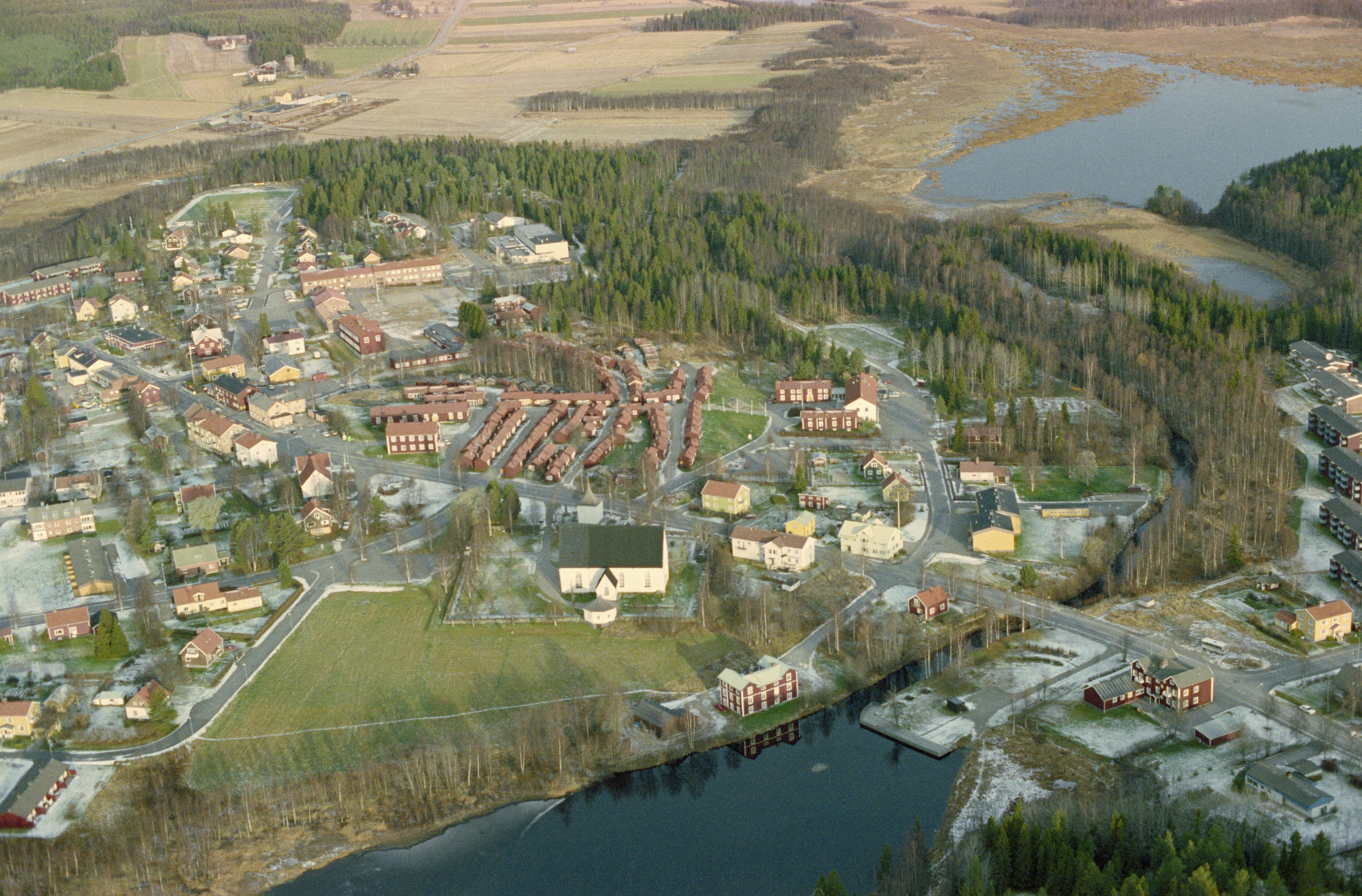 Beskrivning: Lövångers tätort och kyrkby mellan sjöarna Gärdefjärden och Avafjärden. Vid bildens mitt Lövångers kyrka och Lövångers kyrkstad RAÄnr Lövånger 85:1. Bilden är tagen mot (väderstreck): NNV