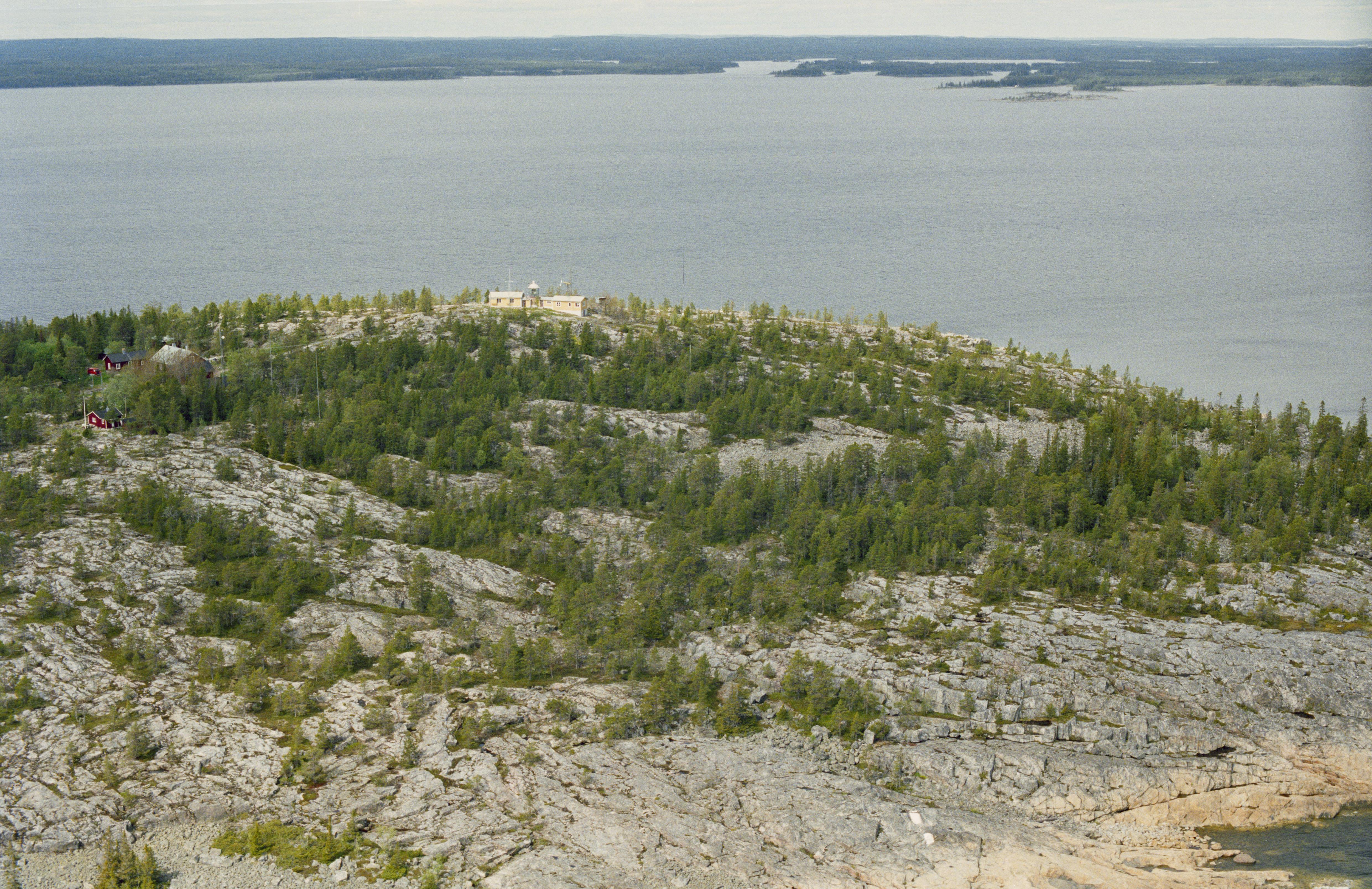 Beskrivning: Udden Bjuröklubb i Bjuröfjärden, norra delen. Till vänster över bildens mitt Bjuröklubbs fyrplats och lotsstation. På udden fiskeläge RAÄnr Lövånger 487:1 m.fl, tomtning RAÄnr Lövånger 131:1 m.fl. I vattnet vid udden fartygslämning RAÄnr Lövånger 540 m.fl. Bilden är tagen mot (väderstreck): NNV