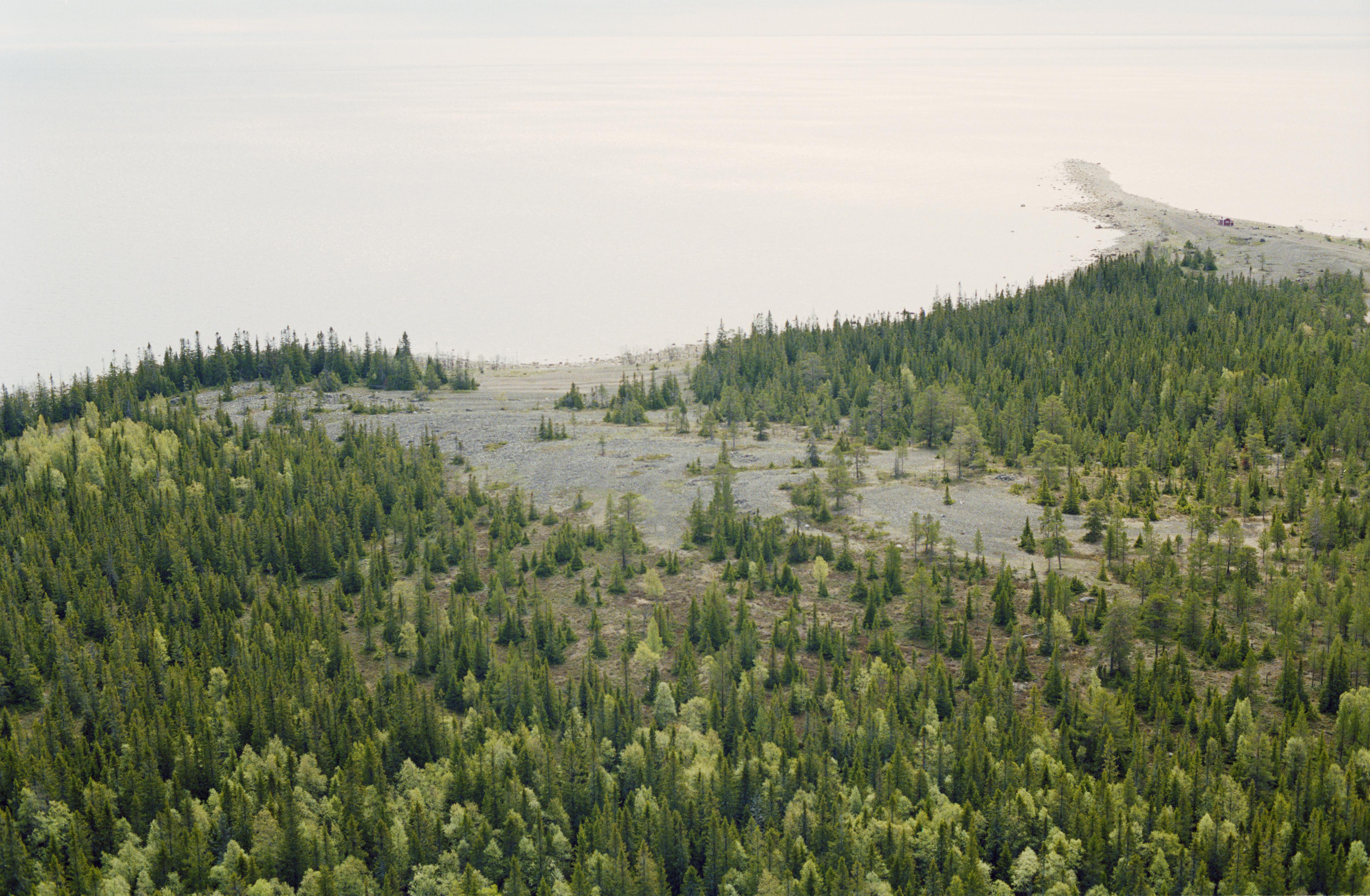 Beskrivning: Området Grundskatan i sydöstra delen av udden Bjuröklubb. Vid bildens mitt Grundskataräften och ett fornlämningsområde med fiskeläge, gravfält och labyrint RAÄnr Lövånger 78:1-2. Bilden är tagen mot (väderstreck): SSO