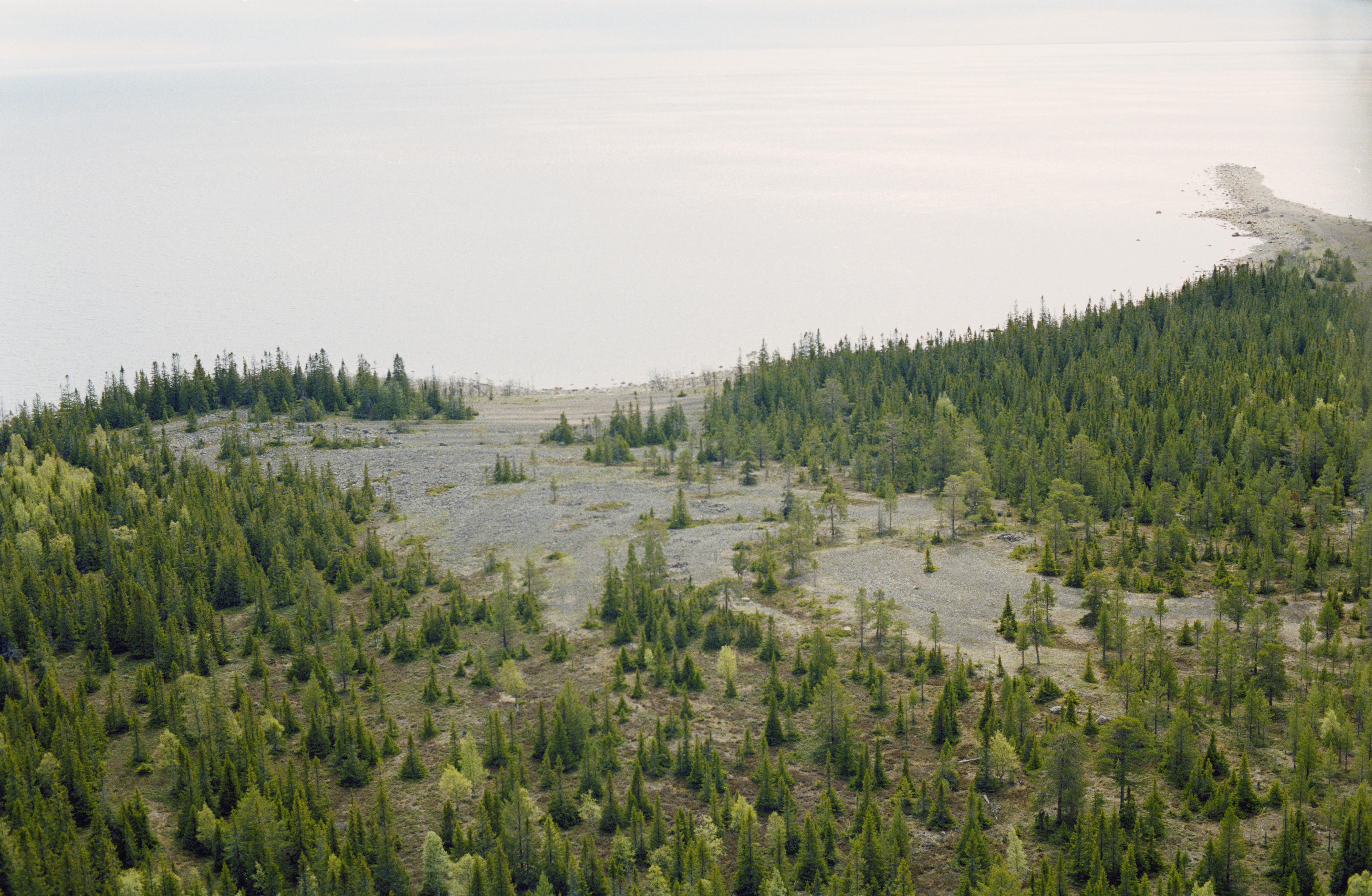 Beskrivning: Området Grundskatan i sydöstra delen av udden Bjuröklubb. Vid bildens mitt Grundskataräften och ett fornlämningsområde med fiskeläge, gravfält och labyrint RAÄnr Lövånger 78:1-2. Bilden är tagen mot (väderstreck): SSO