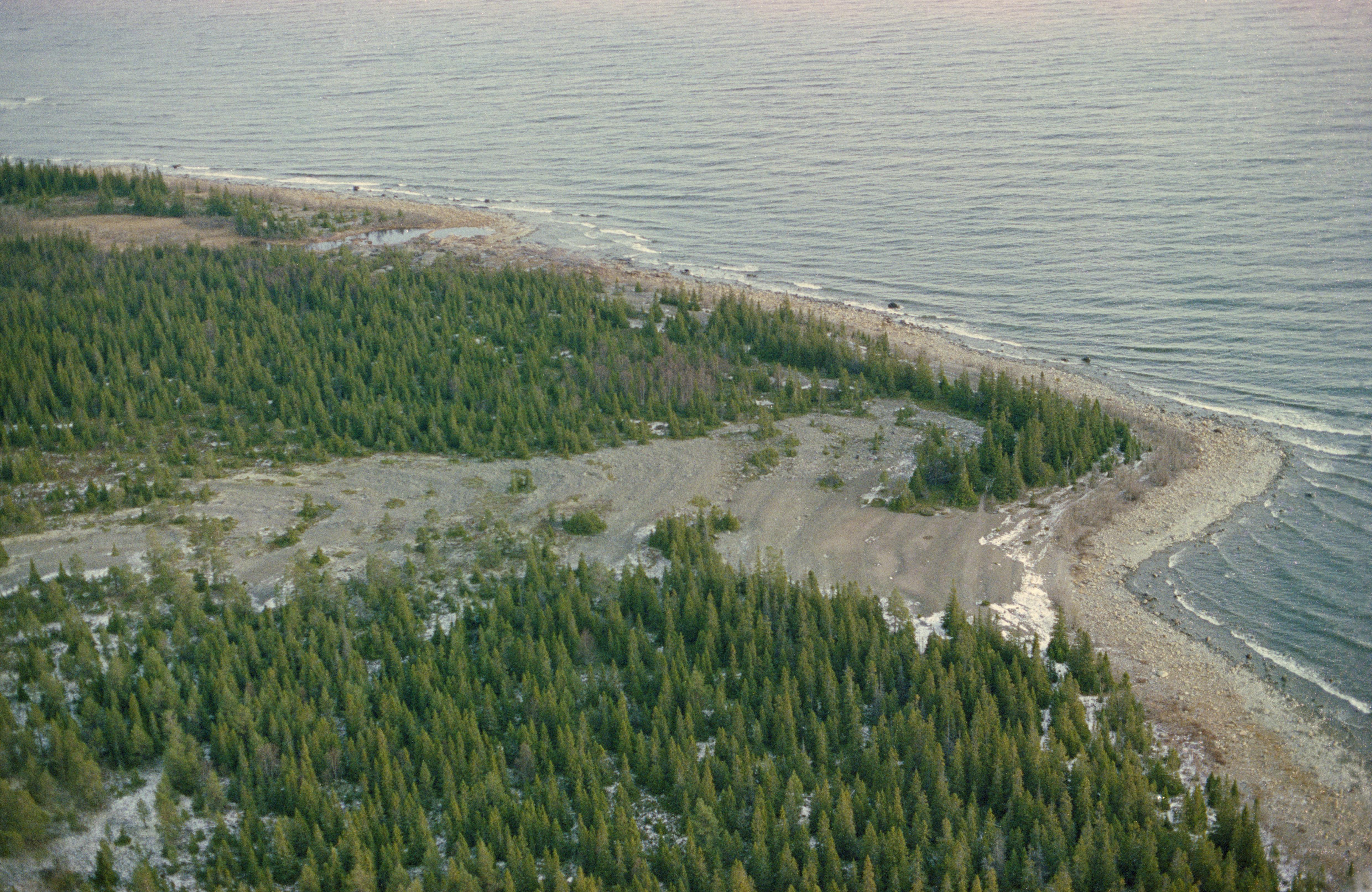 Beskrivning: Området Grundskatan i sydöstra delen av udden Bjuröklubb. Vid och under bildens mitt Grundskataräften och ett fornlämningsområde med fiskeläge, gravfält och labyrint RAÄnr Lövånger 78:1-2. Bilden är tagen mot (väderstreck): NNO