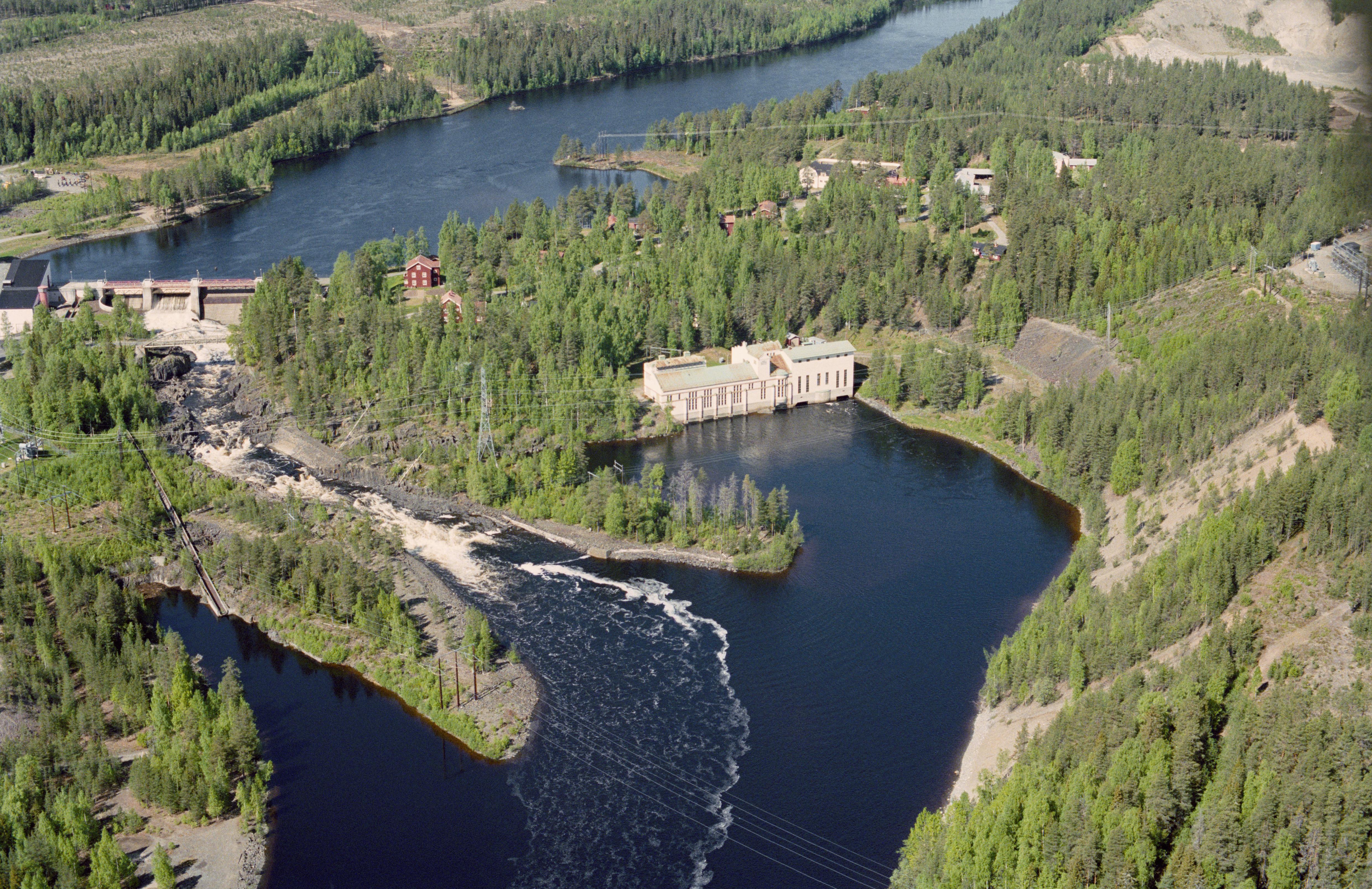 Beskrivning: Kraftverkssamhället Finnforsfallet i Skellefteälvens dalgång vid Finnforsen. Finnfors kraftverk med den nya och den gamla kraftverksbyggnaden. Den gamla byggnaden (i bildens mitt) är numera museum och byggnadsminne. Vid forsen fornlämning RAÄnr Skellefteå stad 13:1. Bilden är tagen mot (väderstreck): VNV