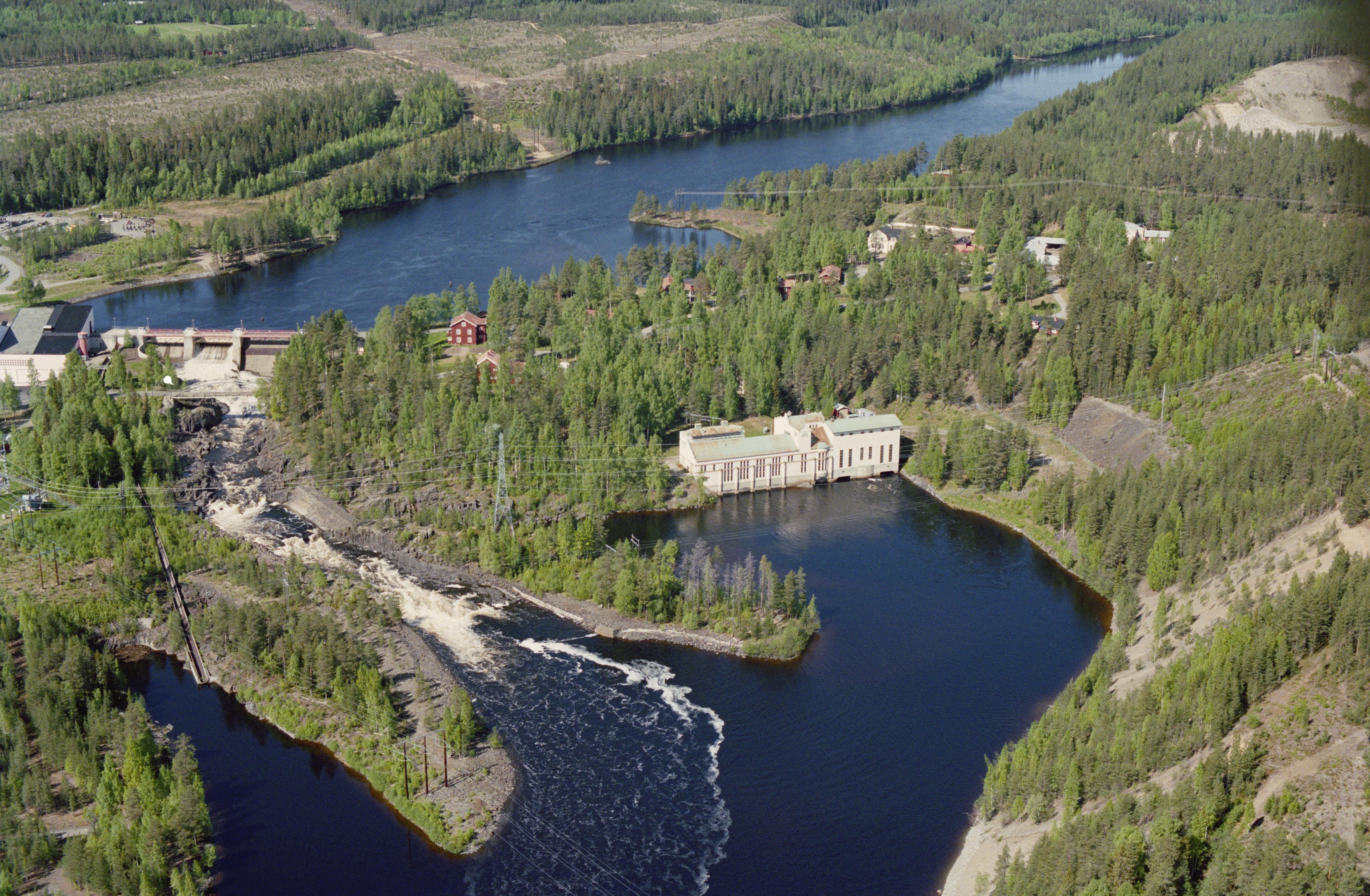 Beskrivning: Kraftverkssamhället Finnforsfallet i Skellefteälvens dalgång vid Finnforsen. Finnfors kraftverk med den nya och den gamla kraftverksbyggnaden. Den gamla byggnaden (i bildens mitt) är numera museum och byggnadsminne. Vid forsen fornlämning RAÄnr Skellefteå stad 13:1. Bilden är tagen mot (väderstreck): VNV