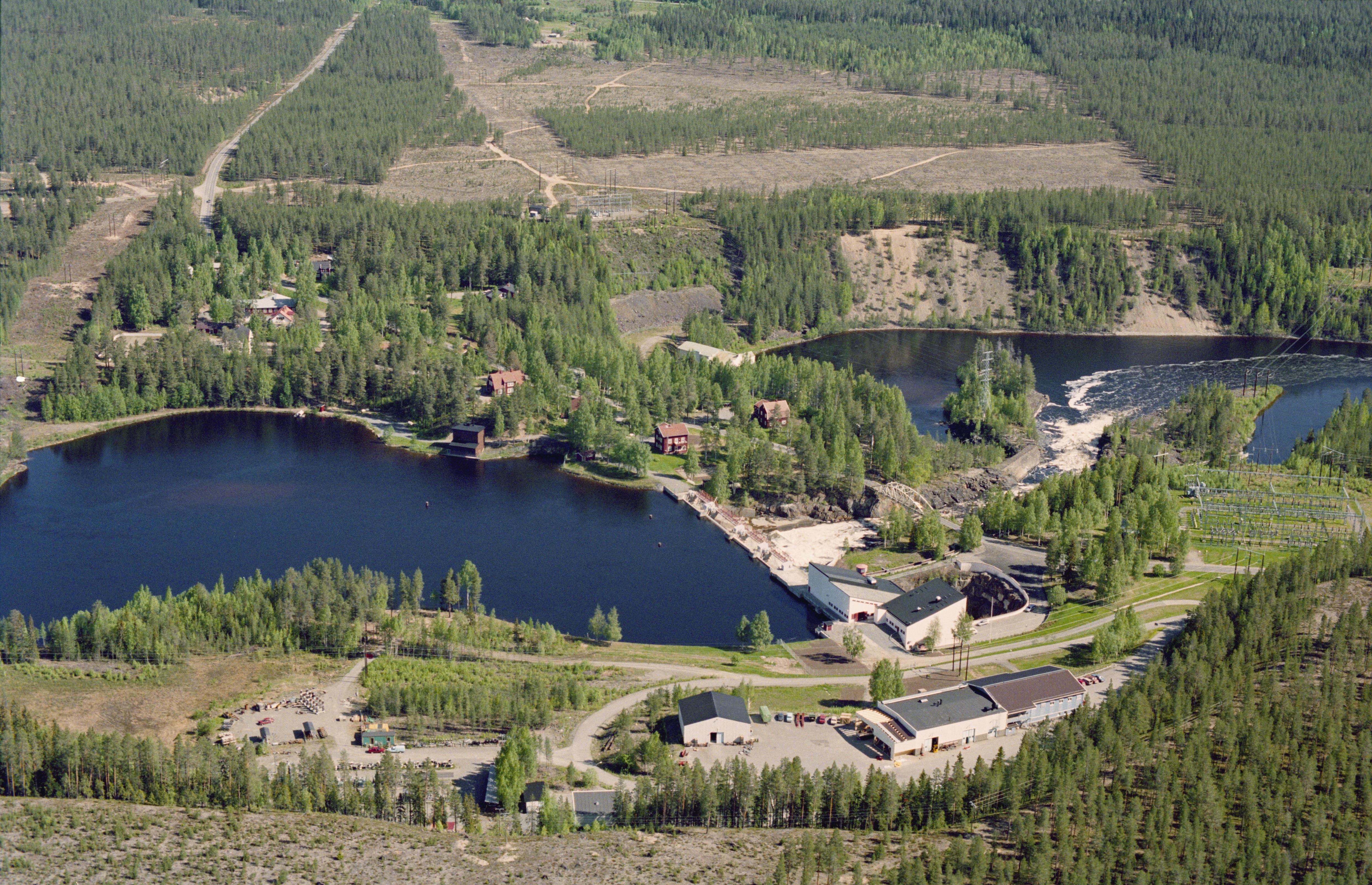 Beskrivning: Kraftverkssamhället Finnforsfallet i Skellefteälvens dalgång vid Finnforsen. Finnfors kraftverk med den nya och den gamla kraftverksbyggnaden. Den gamla byggnaden är numera museum och byggnadsminne. Vid forsen fornlämning RAÄnr Skellefteå stad 13:1. Bilden är tagen mot (väderstreck): NNO