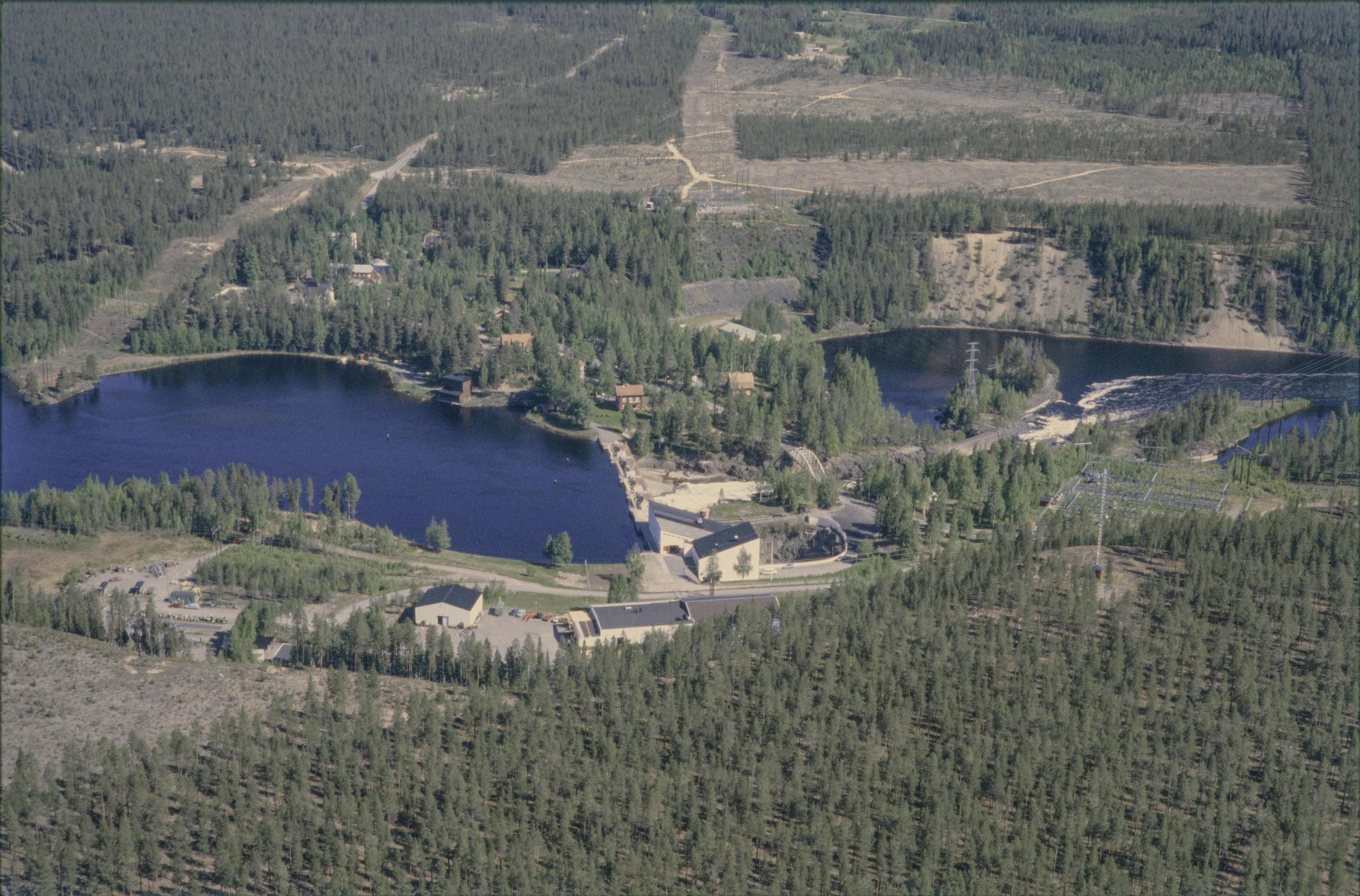 Beskrivning: Kraftverkssamhället Finnforsfallet i Skellefteälvens dalgång vid Finnforsen. Finnfors kraftverk med den nya och den gamla kraftverksbyggnaden. Den gamla byggnaden är numera museum och byggnadsminne. Vid forsen fornlämning RAÄnr Skellefteå stad 13:1. Bilden är tagen mot (väderstreck): N