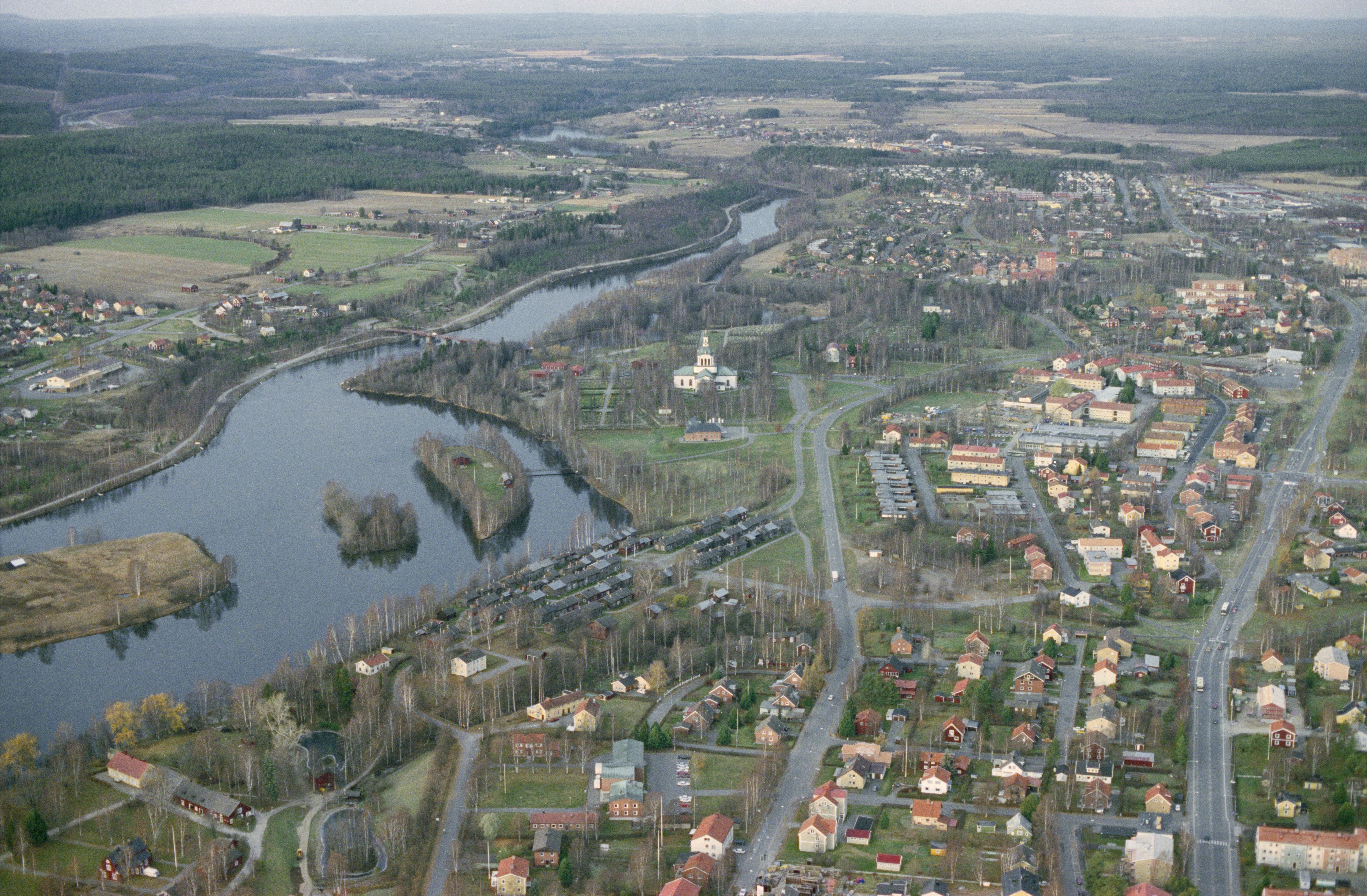 Beskrivning: Skellefteå stad och tätort vid Skellefteälven. Under bildens mitt gränsen mellan socknen Skellefteå stad (i bildens nedre del) och Skellefteå socken (i bildens övre del). Kyrkstaden Bonnstaden RAÄnr Skellefteå stad 140:1 och Landskyrkan vid bildens mitt. Bilden är tagen mot (väderstreck): VSV