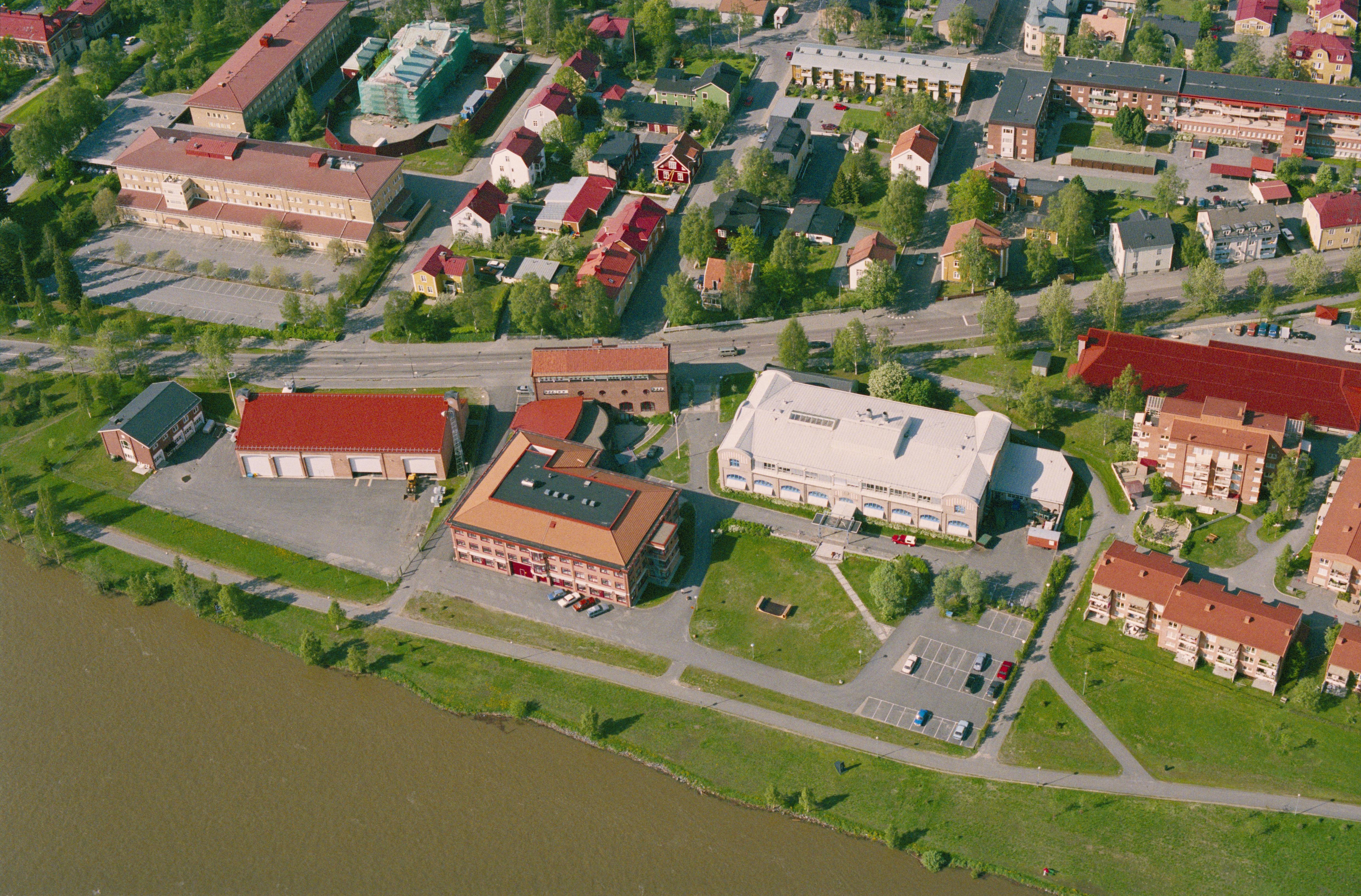 Beskrivning: Umeälven i Umeå stad, öster om stadens centrum. I bildens nedre del ett tidigare industriområde vid Umeälven som byggts om till högskoleområde (Konsthögskolan och Designhögskolan). Bilden är tagen mot (väderstreck): N