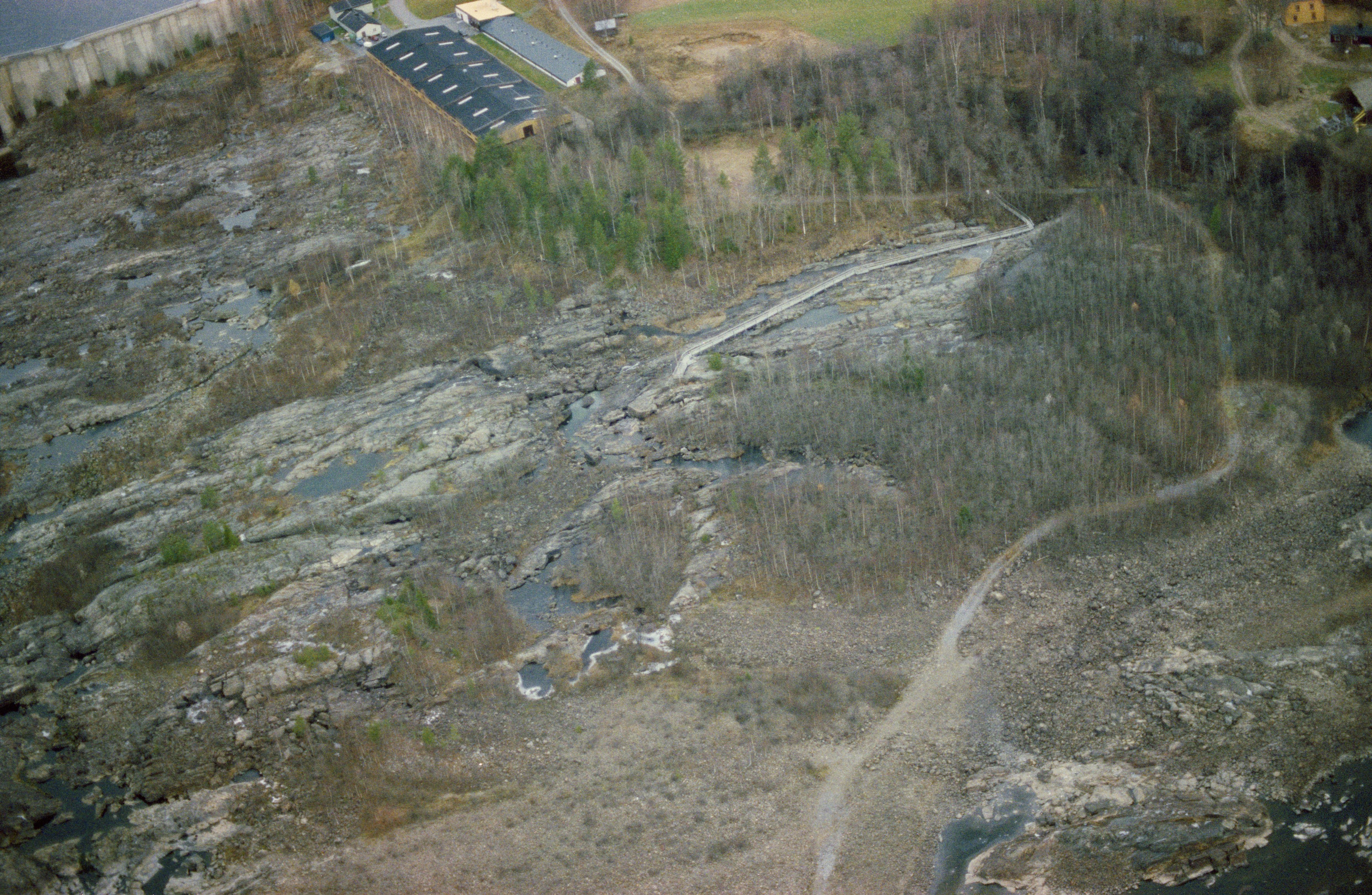 Beskrivning: Norrforsen och Stornorrfors kraftverk mellan byarna Sörforsen och Norrforsen i Umeälvens dalgång. Vid bildens mitt hällristningsområdet Truthällorna RAÄnr Umeå stad 365:1. Bilden är tagen mot (väderstreck): N