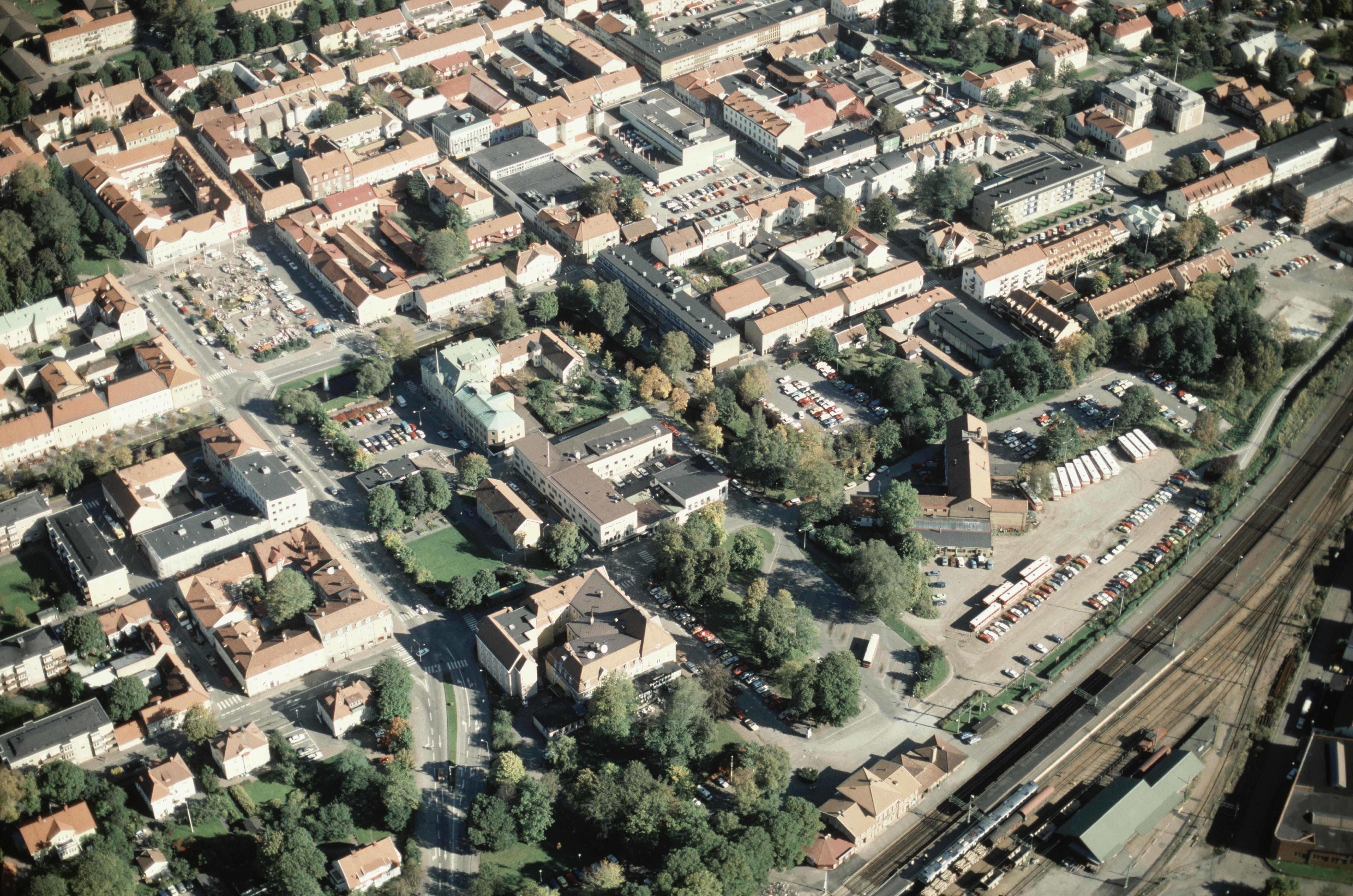 Beskrivning: Alingsås stad. Stora torget till vänster om bildens mitt. Alingsås järnvägsstation nere till höger. Bilden är tagen mot (väderstreck): NO