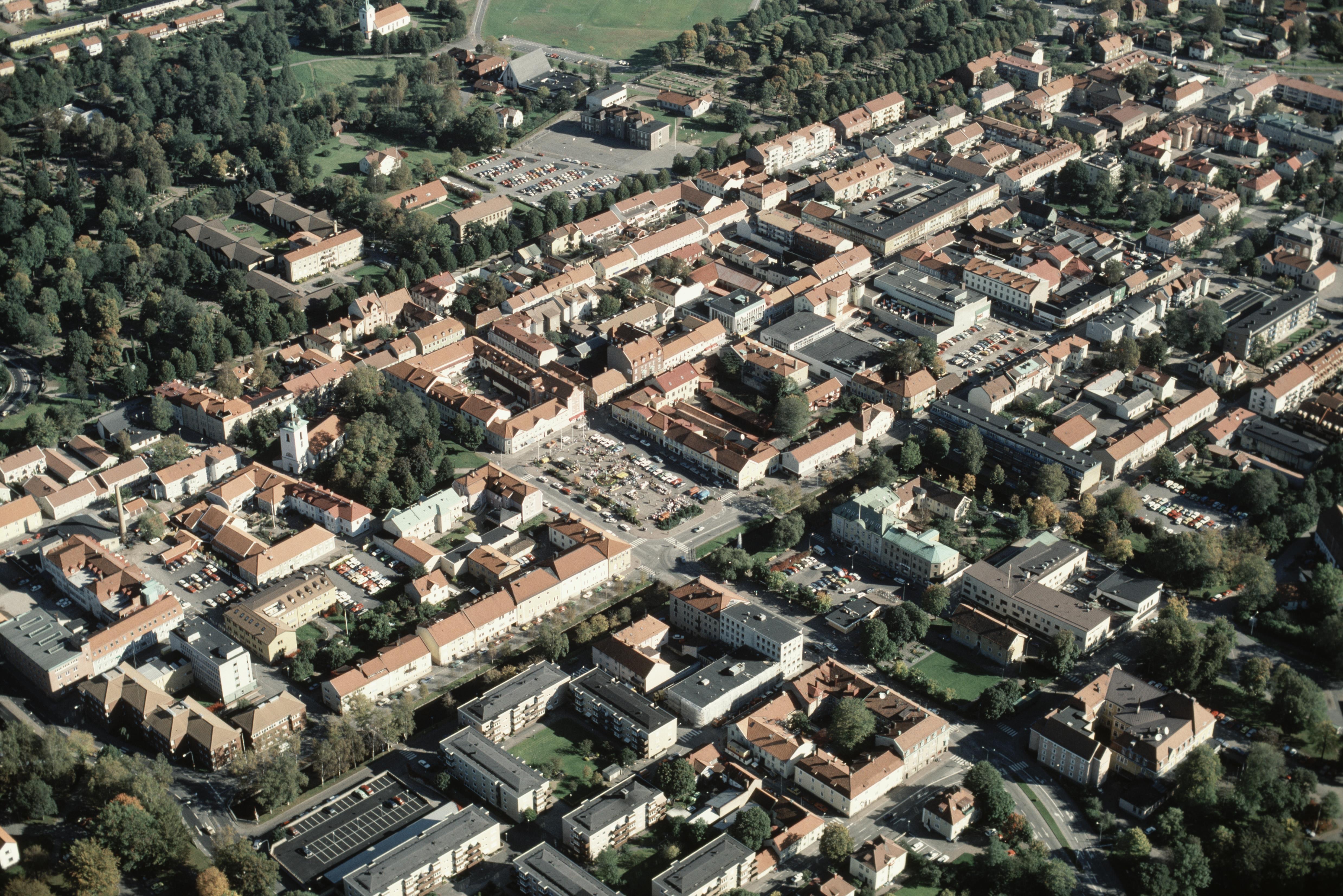 Beskrivning: Anmärkning (övrig): Riksintresse-nr/namn: P36 - Alingsås innerstad. Socken: Allingsås. Motivering: Småstadsmiljö med välbevarad trästadsbebyggelse anpassad till stadens huvudsakligen under 1600- och 1700-talet framvuxna stadsplan och bl a förknippad med Jonas Alströmer och dennes statsfinansierade industriprojekt under 1700-talet. (Industrimiljö, Kognitiv miljö). - Uttryck för riksintresset: Rutnätsplan och tomtindelning som bevarar oregelbundna drag från det tidiga 1600-talet och som genom regleringar och utvidgningar under 1700-talet och 1800-talet fått alltmer regelbunden form. Kyrka från samma tid, trästadsbebyggelse med handels- och hantverksgårdar från 1700-och 1800-talet, det Alströmerska magasinet från(…) Texten i detta fält har förkortats vid migrering till e-arkivet. Se filbilagan extra.xml för fullständig information under note_archivist. Beskrivning: Alingsås stad. Christina kyrka och Stora torget vid bildens mitt. Till vänster i bildens övre del Landskyrkan. Bilden är tagen mot (väderstreck): NO Fotosyfte: Flygbildsdokumentation