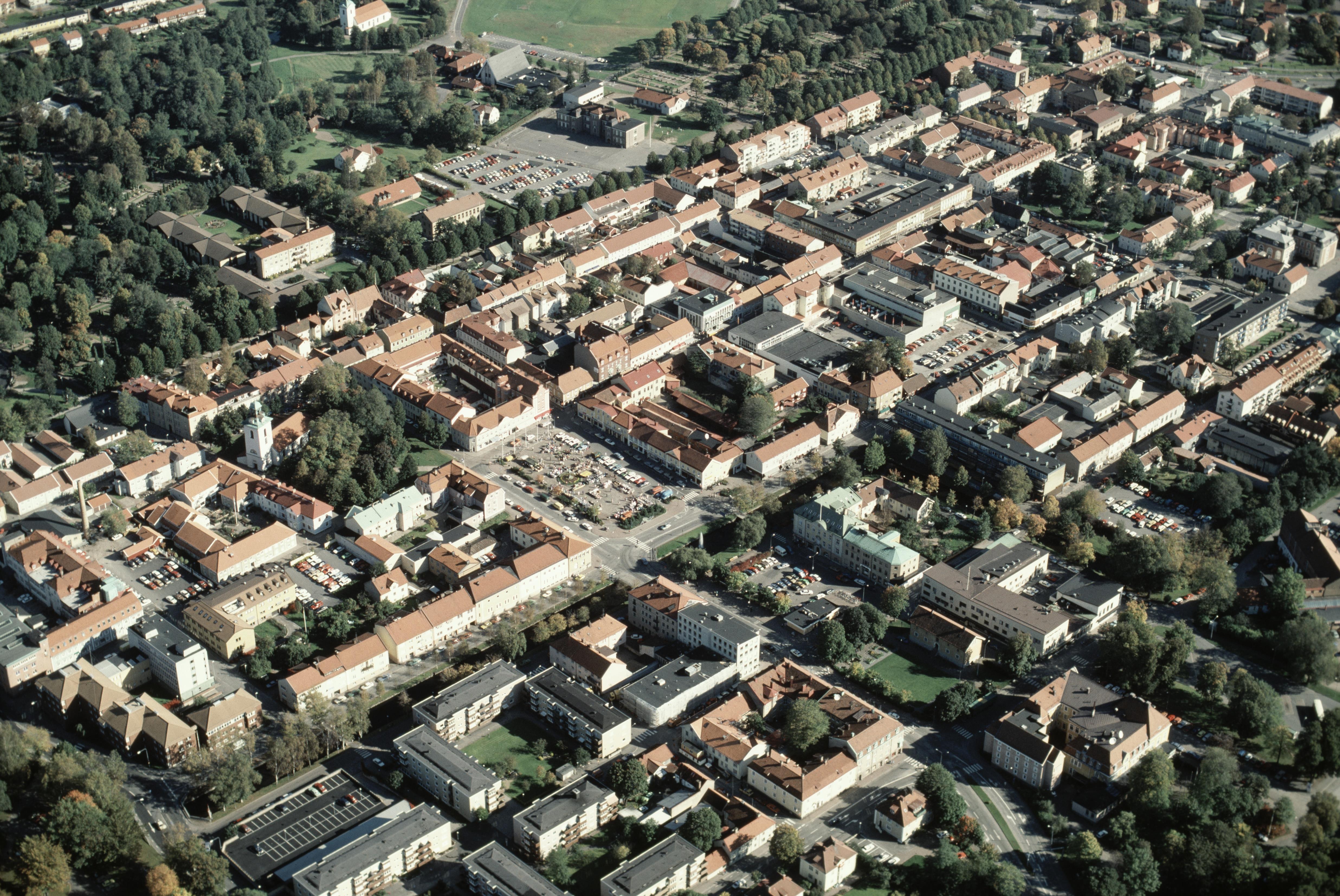 Beskrivning: Alingsås stad. Christina kyrka och Stora torget vid bildens mitt. Till vänster i bildens övre del Landskyrkan. Bilden är tagen mot (väderstreck): NO